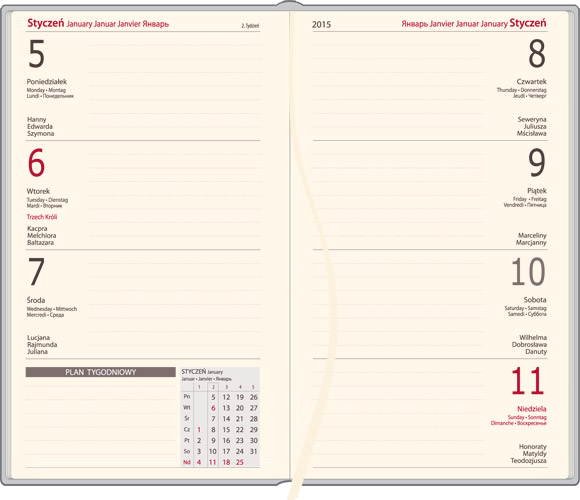 | Układ: | tygodniowy, 1 tydzień na 2 stronach (cały tydzień na rozkładówce) |