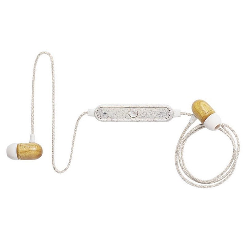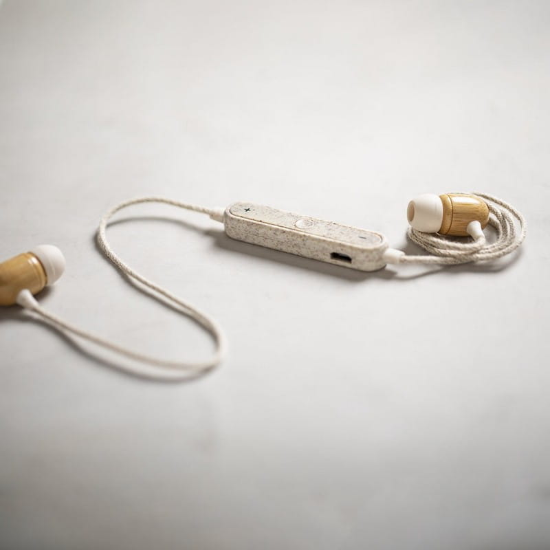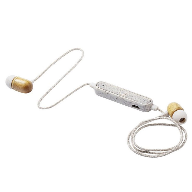Słuchawki bezprzewodowe BT 5.0, douszne, słuchawki wykonane z bambusa, panel regulacji wykonany ze słomy pszenicznej, kable pokryte materiałem z konopi, funkcja odbierania połączeń, panel regulacji, ładowane przez USB, zasięg do 10 m, bateria 60 mAh, czas pracy: 3h, kabel micro USB w komplecie