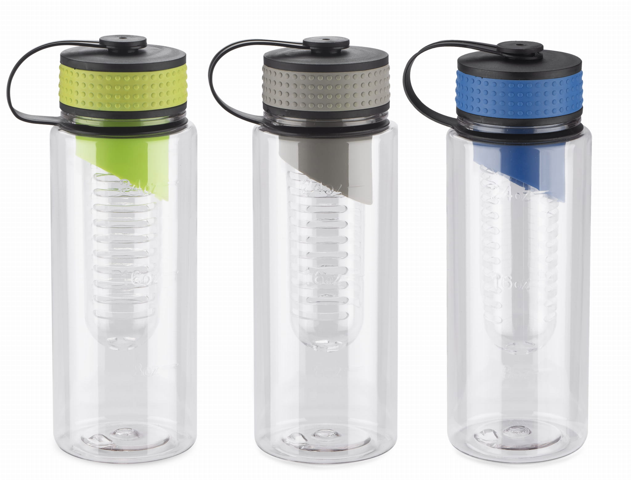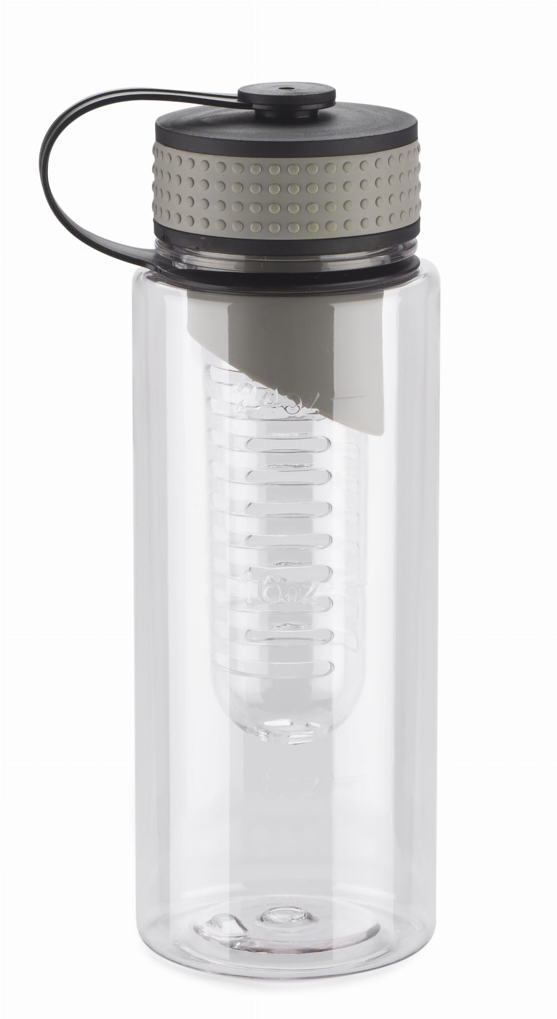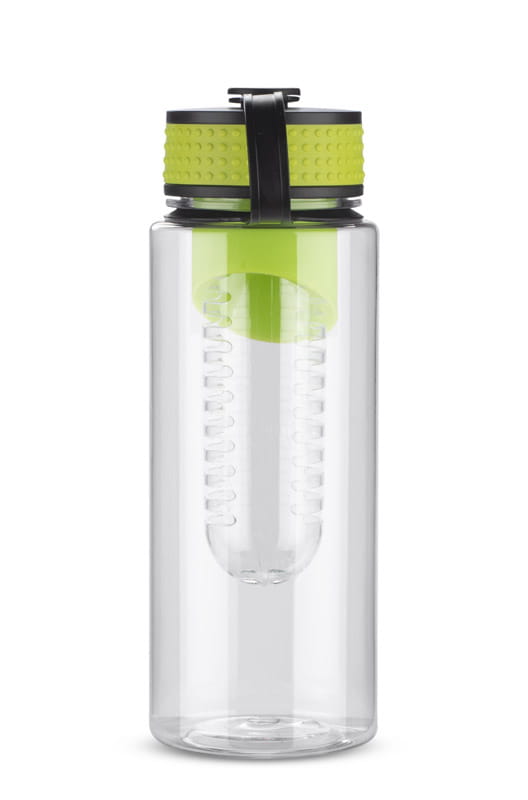 Bidon posiadający wkład na owoce. Pojemność 800 ml. Wykonany z tritanu. Zapakowany w woreczek biodegradowalny.