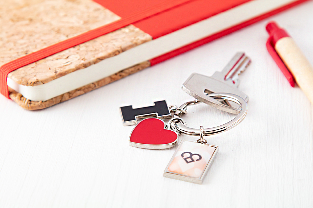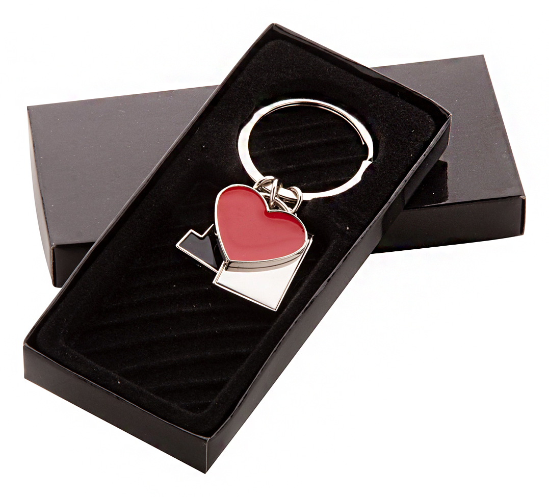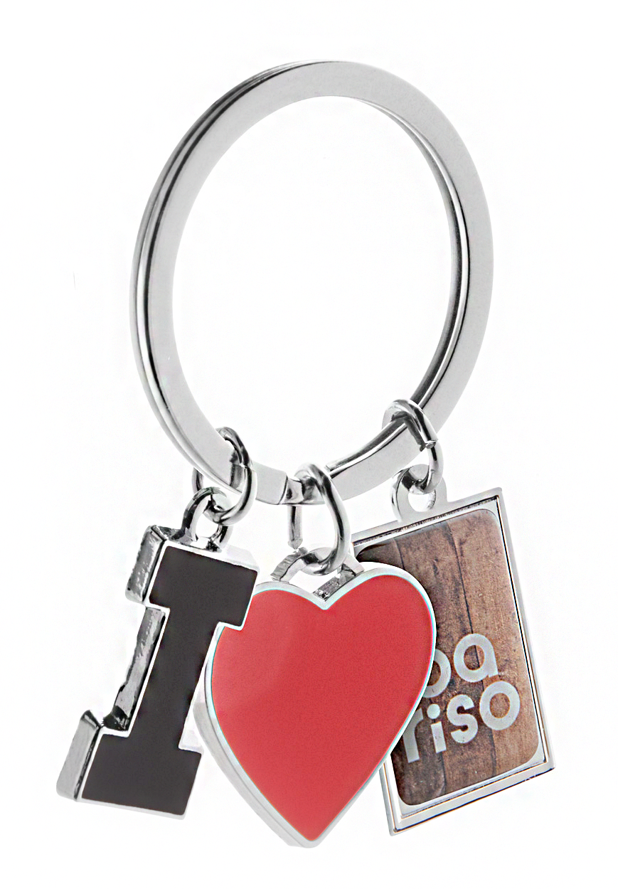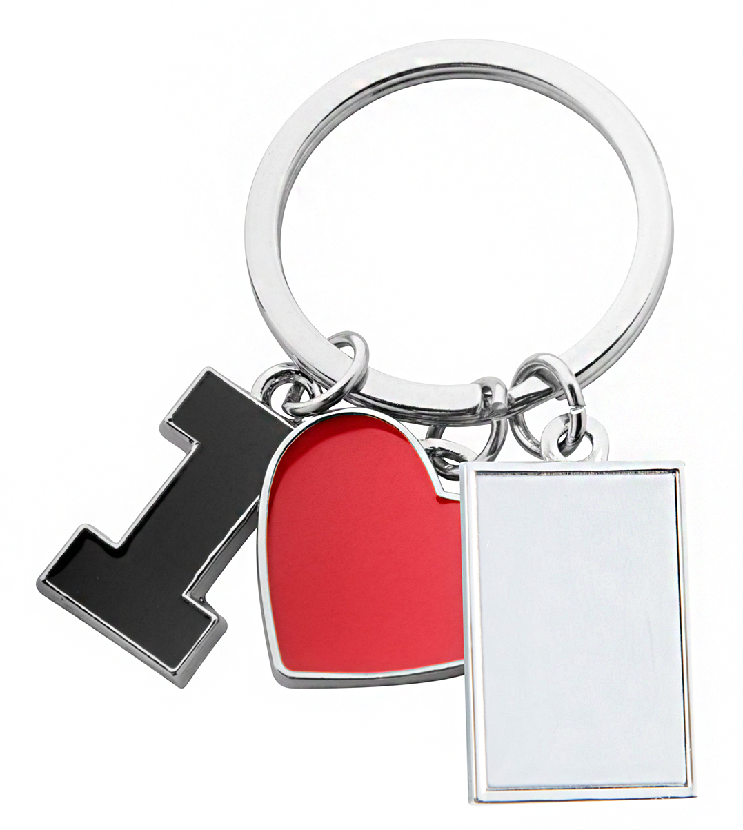 Metalowy brelok z trzema końcówkami w kształacie: litery "I", kwadratu i serca. W czarnym kartoniku.