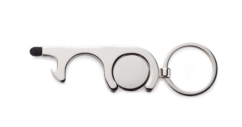 Brelok anti – touch to uniwersalny dodatek do kluczy. Z jego pomocą nie trzeba dotykać bezpośrednio klamek czy przycisków np. w bankomacie. Brelok zawiera monetę do wózków sklepowych oraz pełni funkcję otwieracza do butelek. Na monecie możemy wygrawerować Państwa logo. Na zakończeniu breloka zamocowana jest gumka, dzięki której możemy zastosować go przy ekranach dotykowych. To przydatny gadżet, zwłaszcza w czasie epidemii. Brelok pakowany jest w brązową, papierową kopertę.