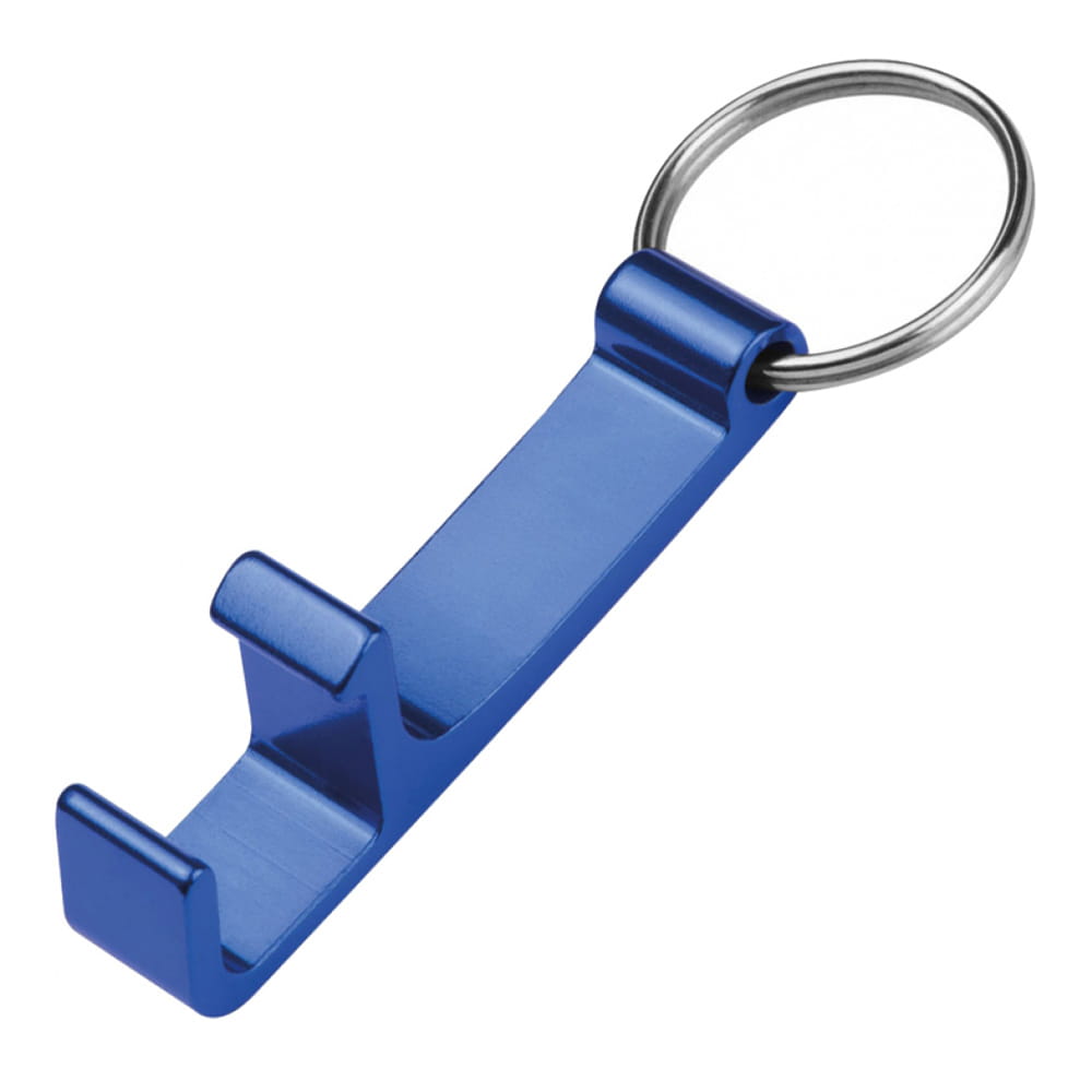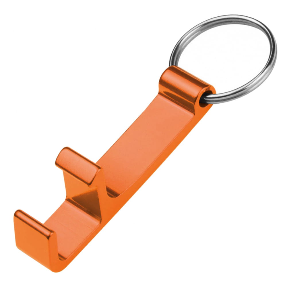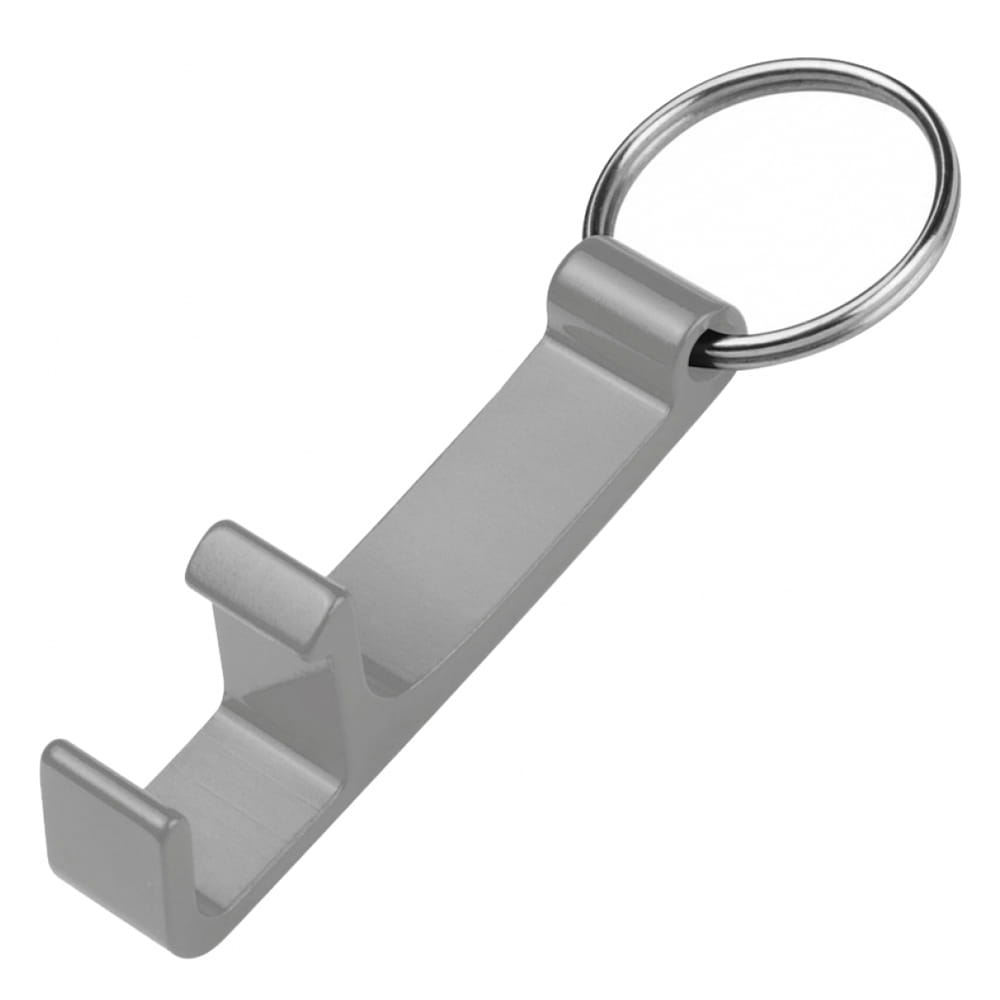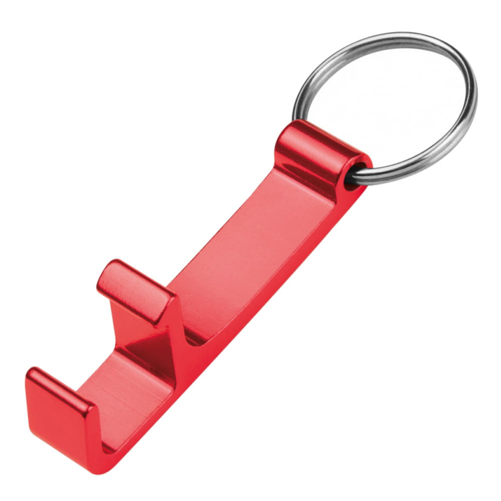 Metalowy brelok z otwieraczem do butelek, którego można użyć również jako stojaka na telefon.