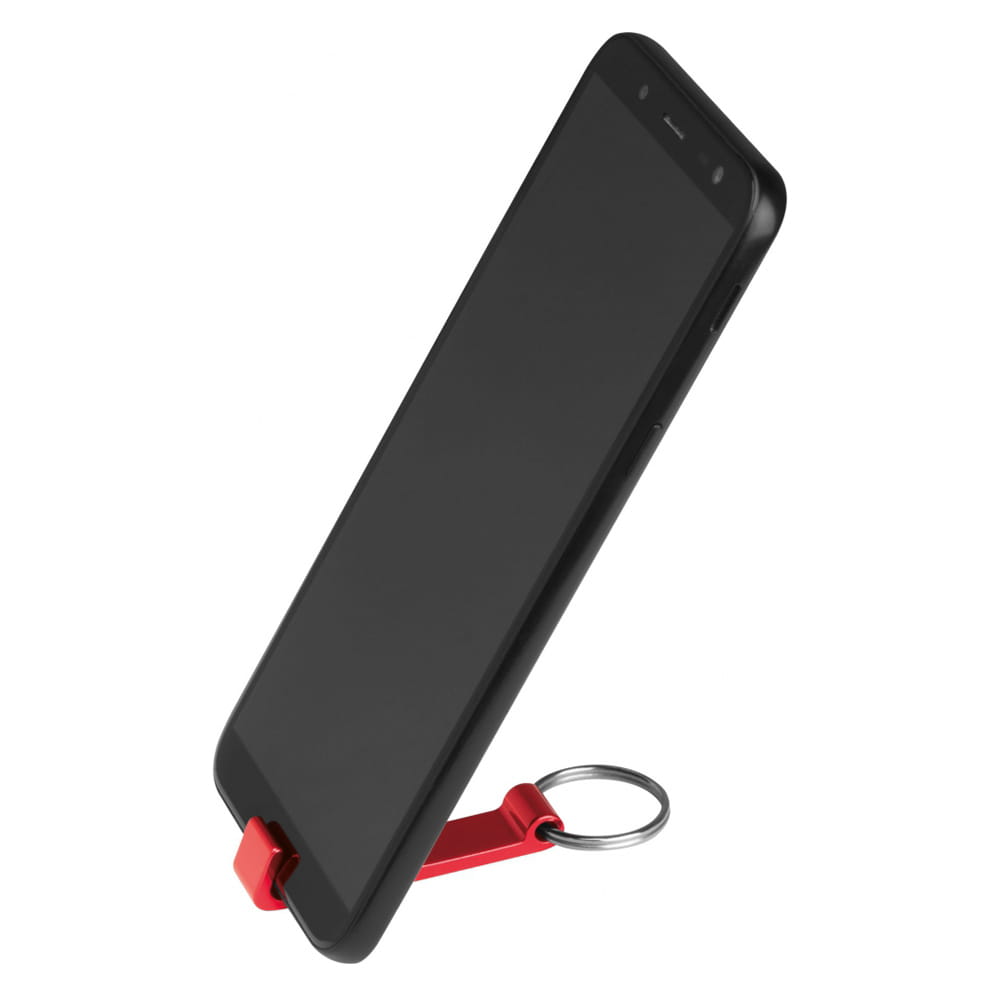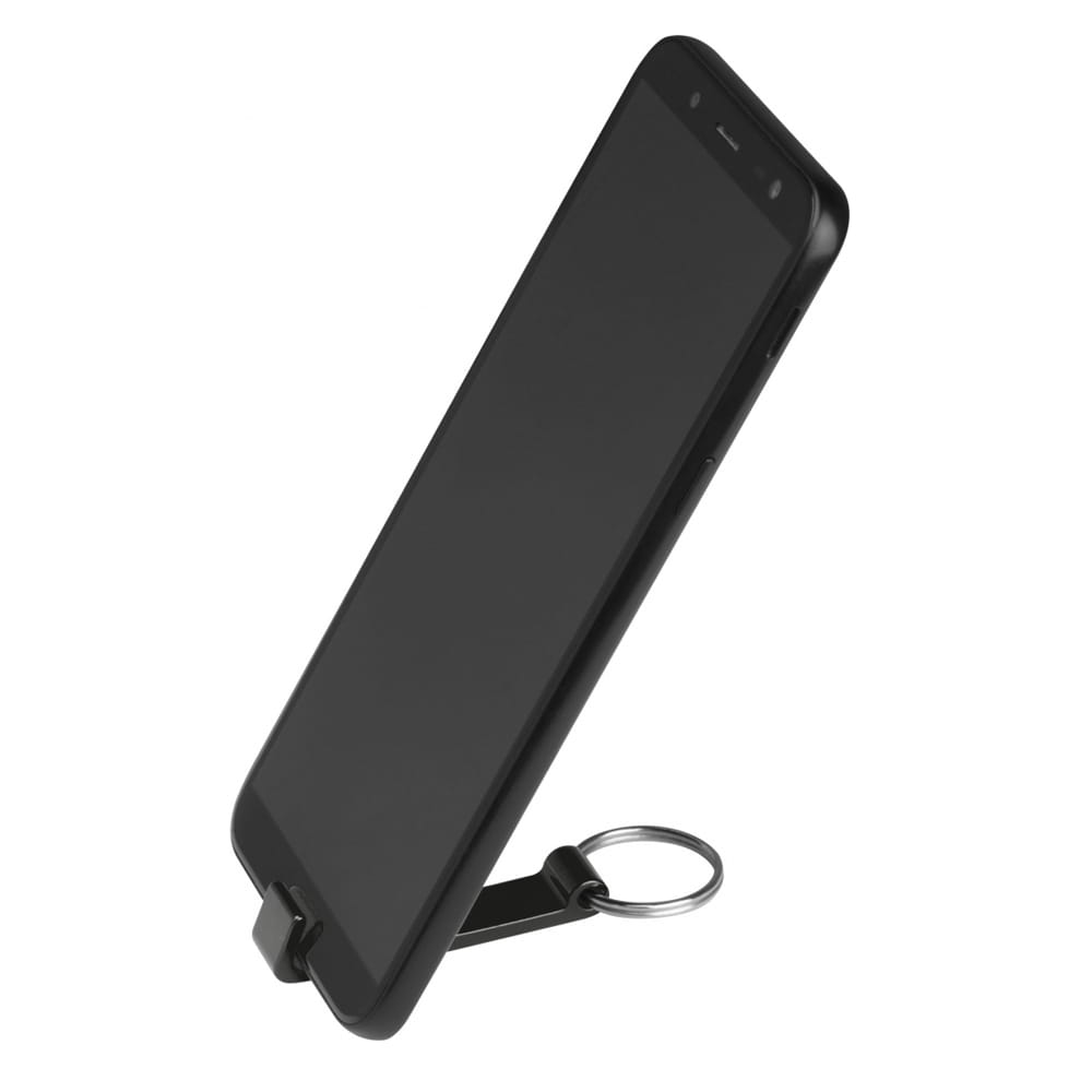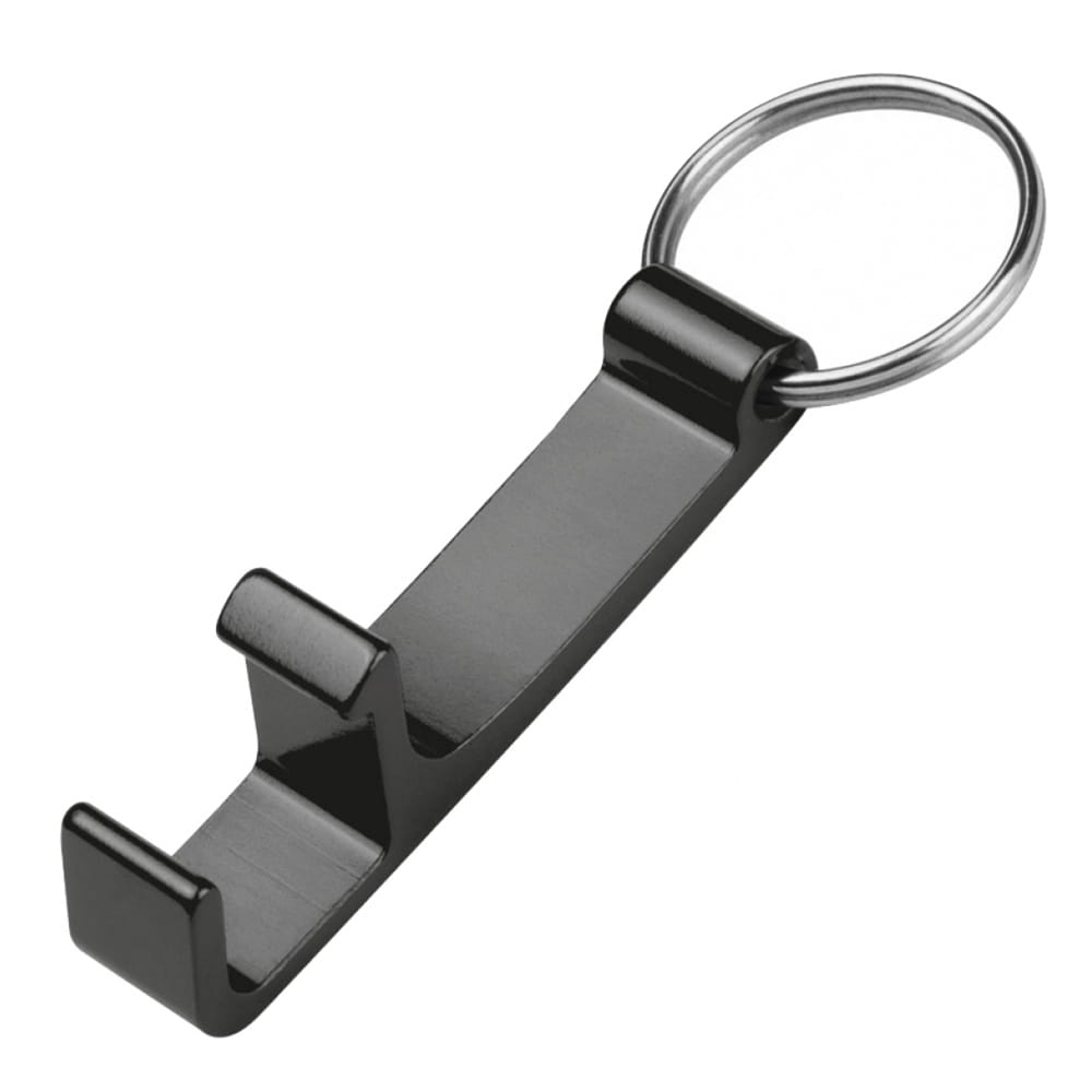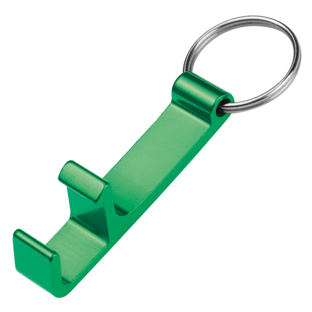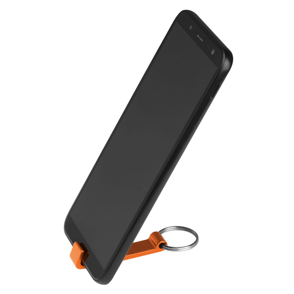 Metalowy brelok z otwieraczem do butelek, którego można użyć również jako stojaka na telefon.