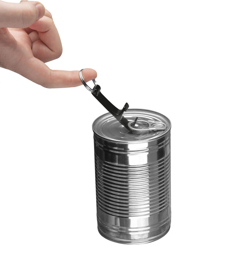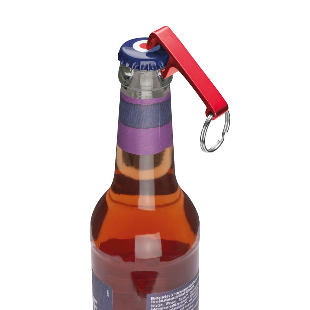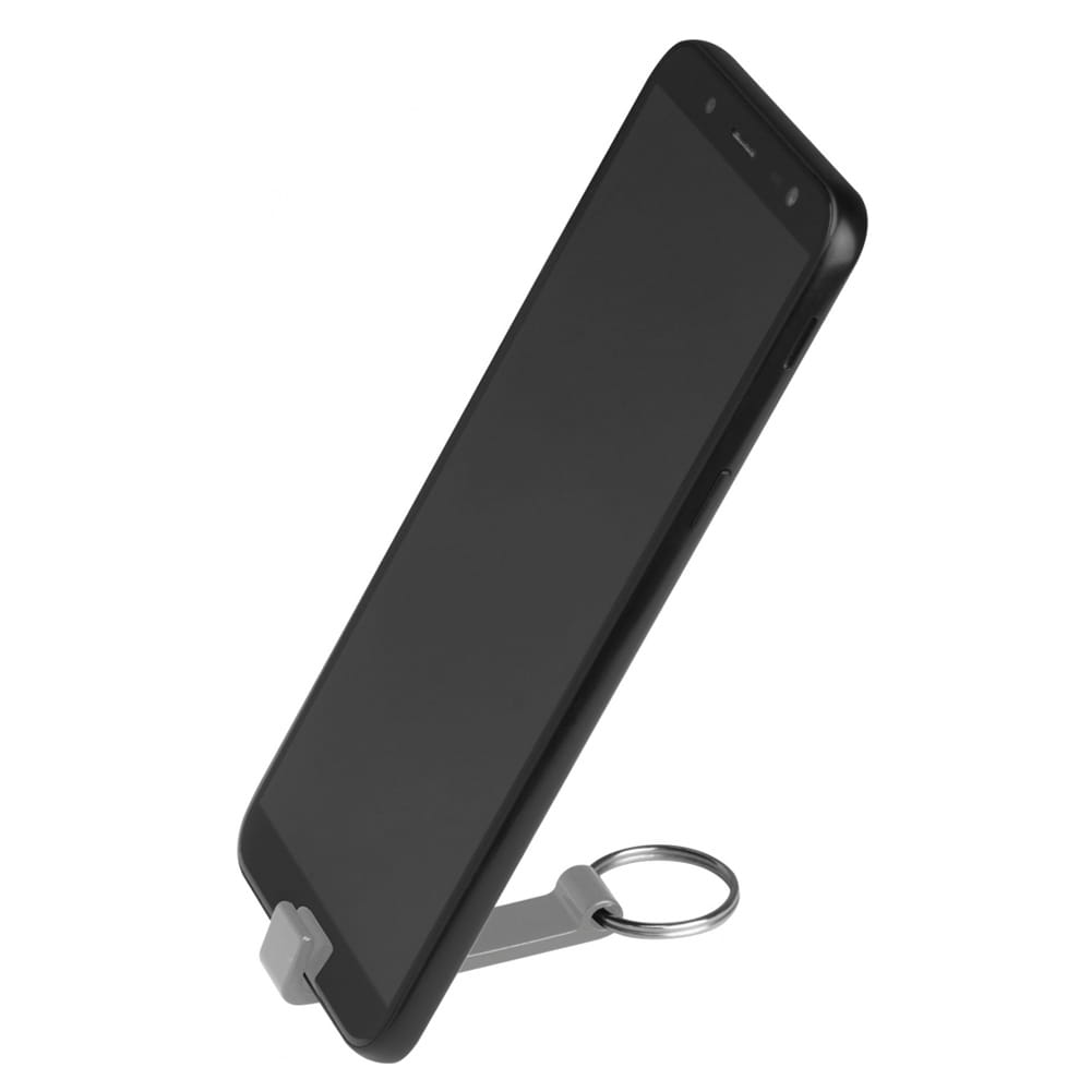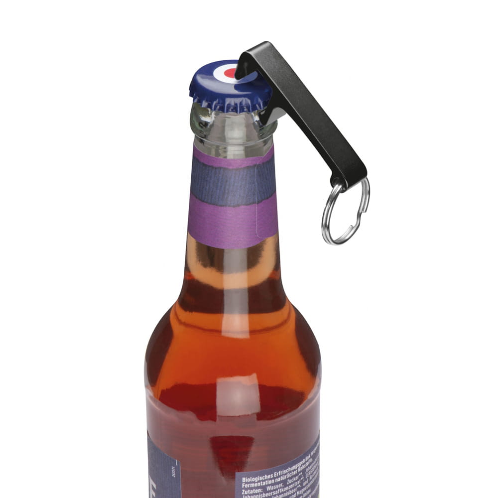 Metalowy brelok z otwieraczem do butelek, którego można użyć również jako stojaka na telefon.