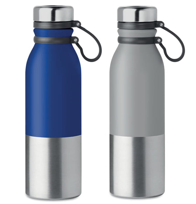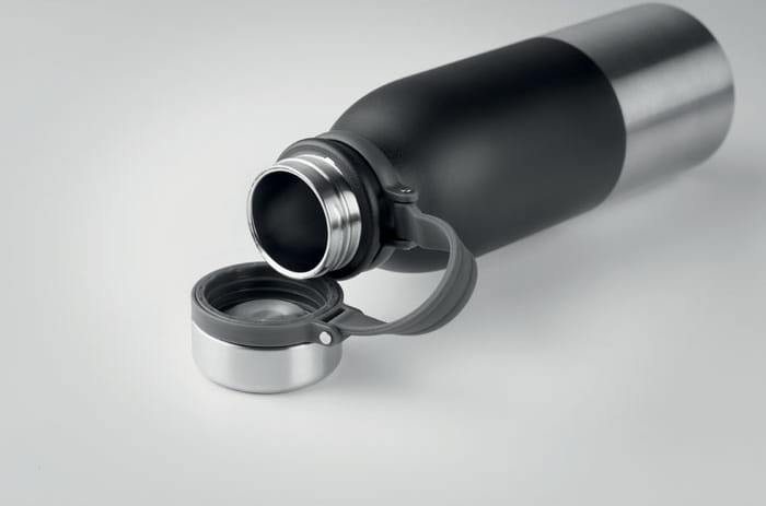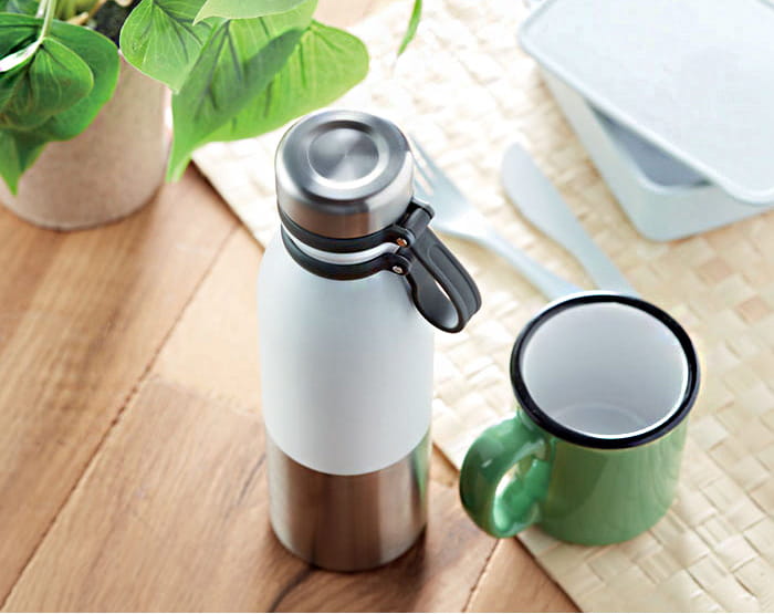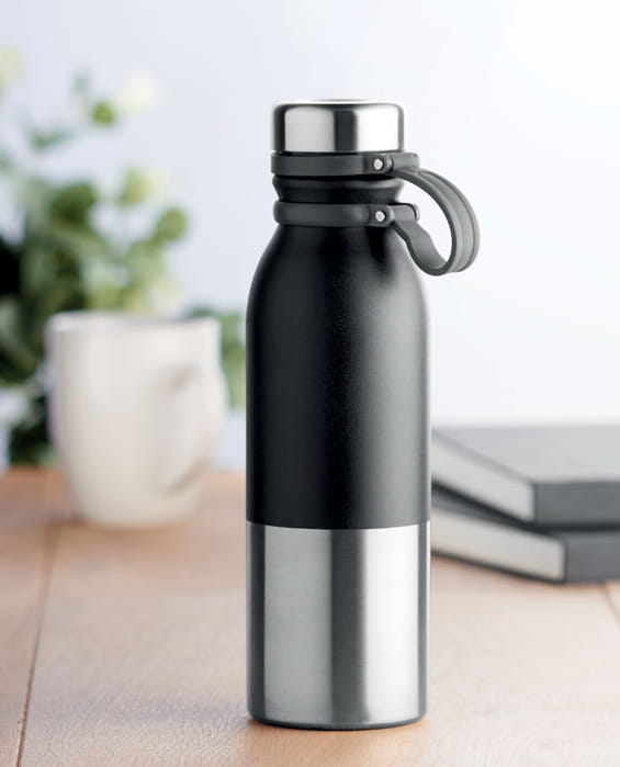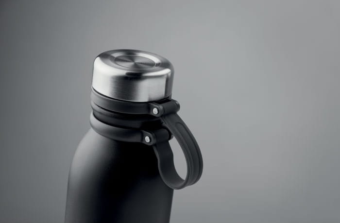 Dwuścienna malowana proszkowo butelka ze stali nierdzewnej z silikonowym uchwytem do łatwego przenoszenia. Pojemność: 600 ml. Szczelna.