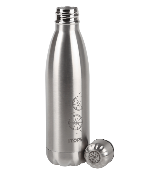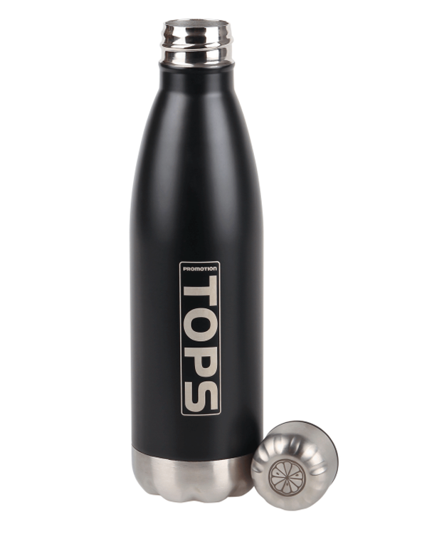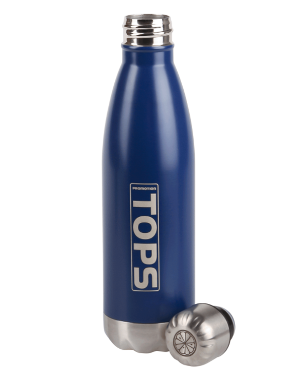 Butelka próżniowa o podwójnych ściankach GOLDEN. Wewnątrz i na zewnątrz ze stali nierdzewnej, z bezpieczną zakrętką, o pojemności ok. 500 ml.
