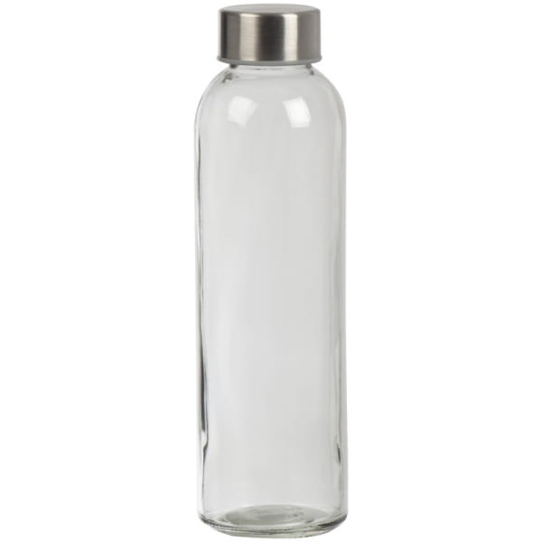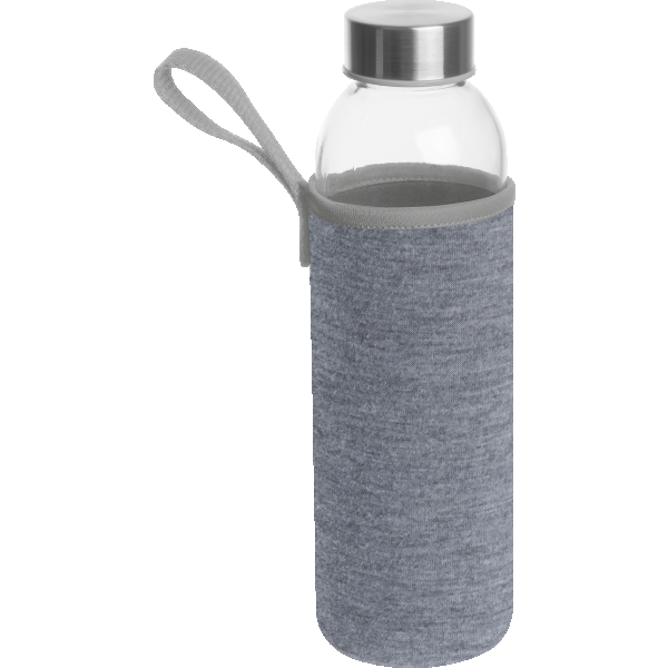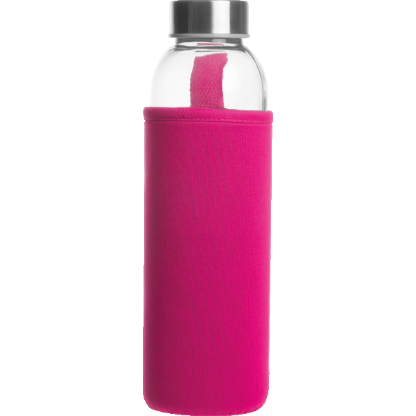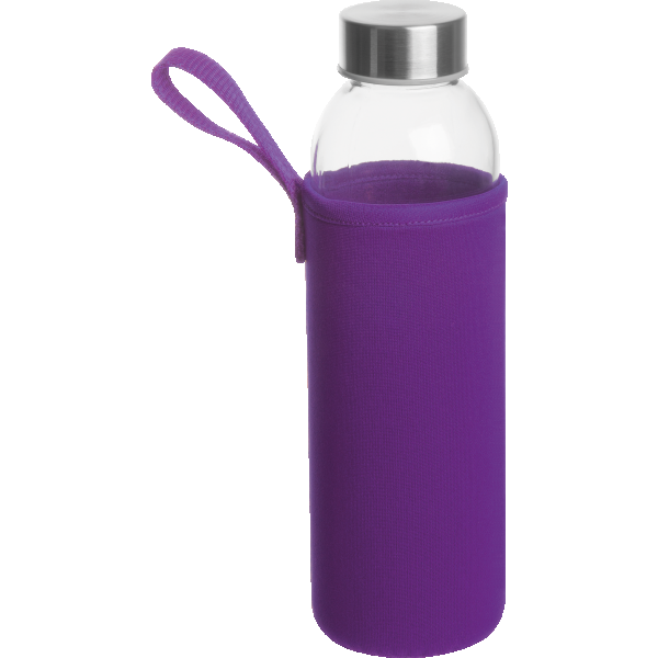 Nowoczesna szklana butelka o pojemności 500 ml z metalową zakrętką. Produkt w etui z neoprenu, dostępna w bogatej gamie kolorystycznej.