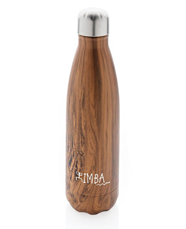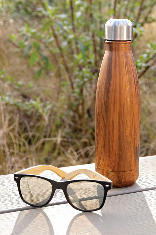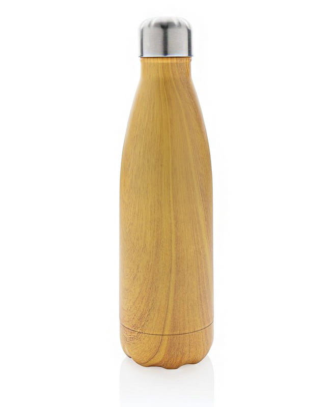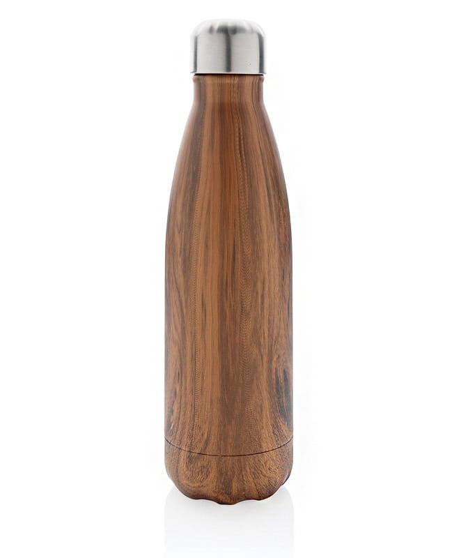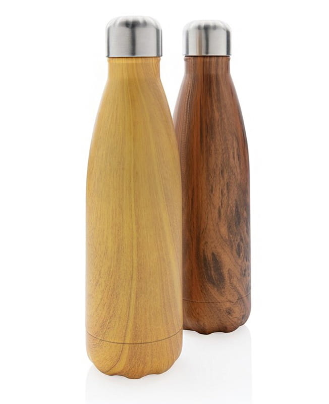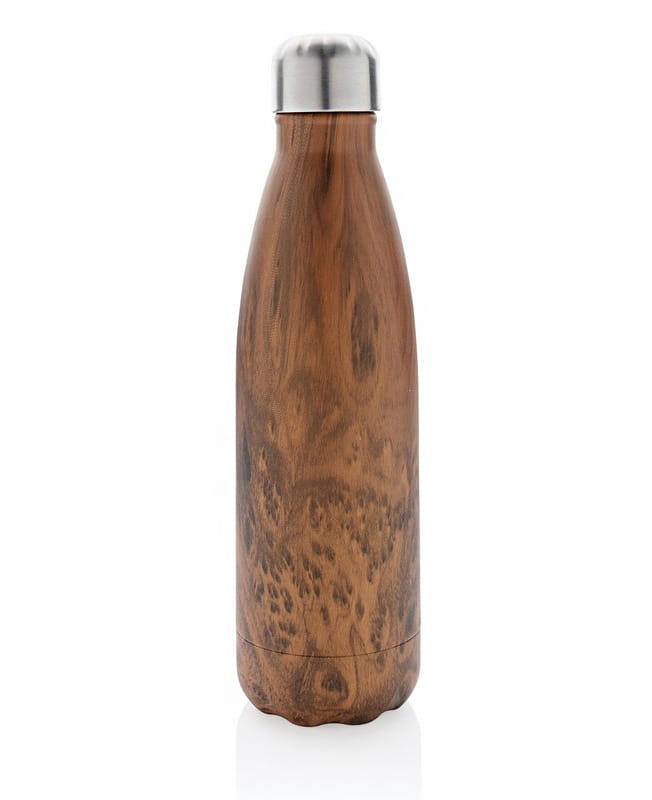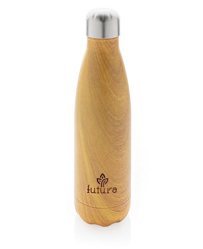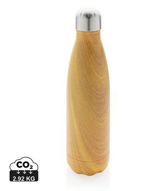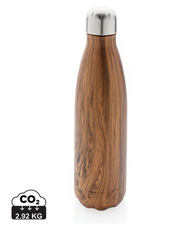 Butelka termiczna 500 ml z nadrukiem drewna, podwójne ścianki ze stali nierdzewnej z próżnią pomiędzy, utrzymuje temperaturę napojów ciepłych do 5 godzin oraz zimnych do 15 godzin, klasa termiczna: A, ślad węglowy produktu: 2,92 kg CO2