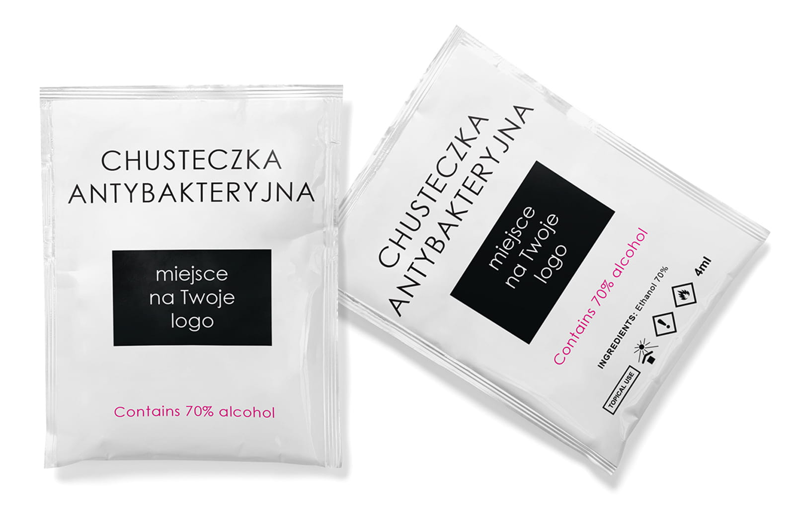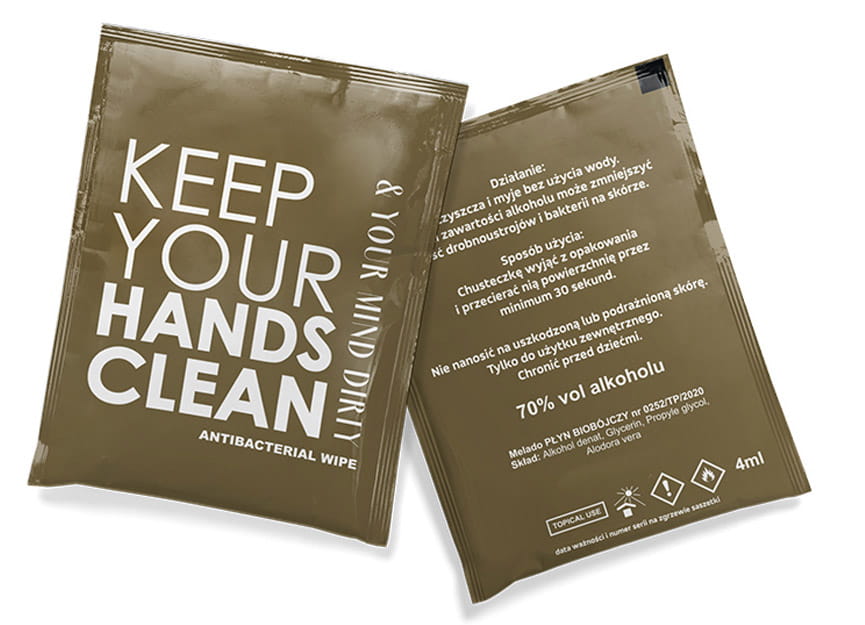 Chusteczki dezynfekujące z możliwością umieszczenia loga firmy. Minimum zamówienia 10 000 szt.