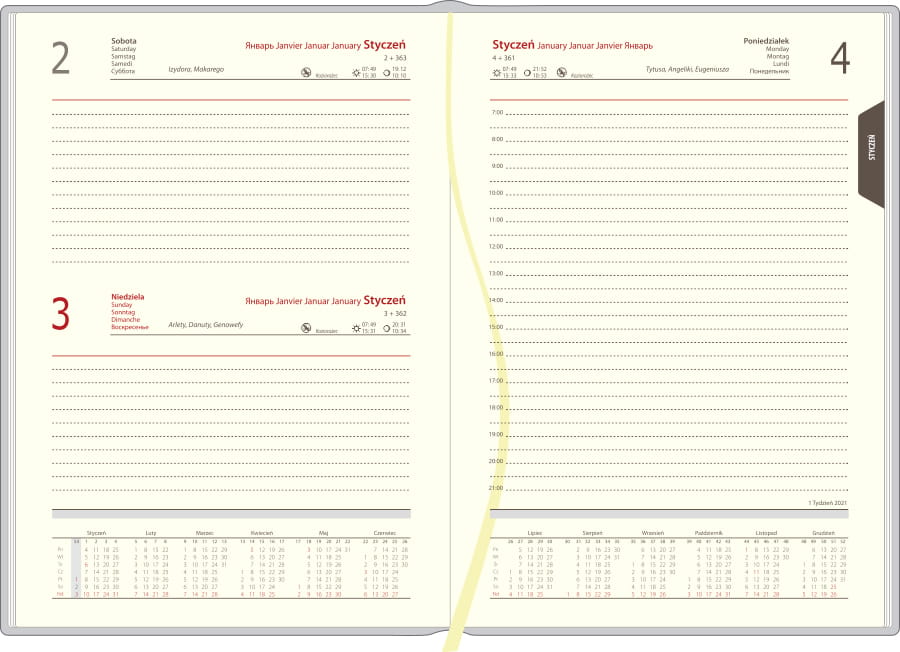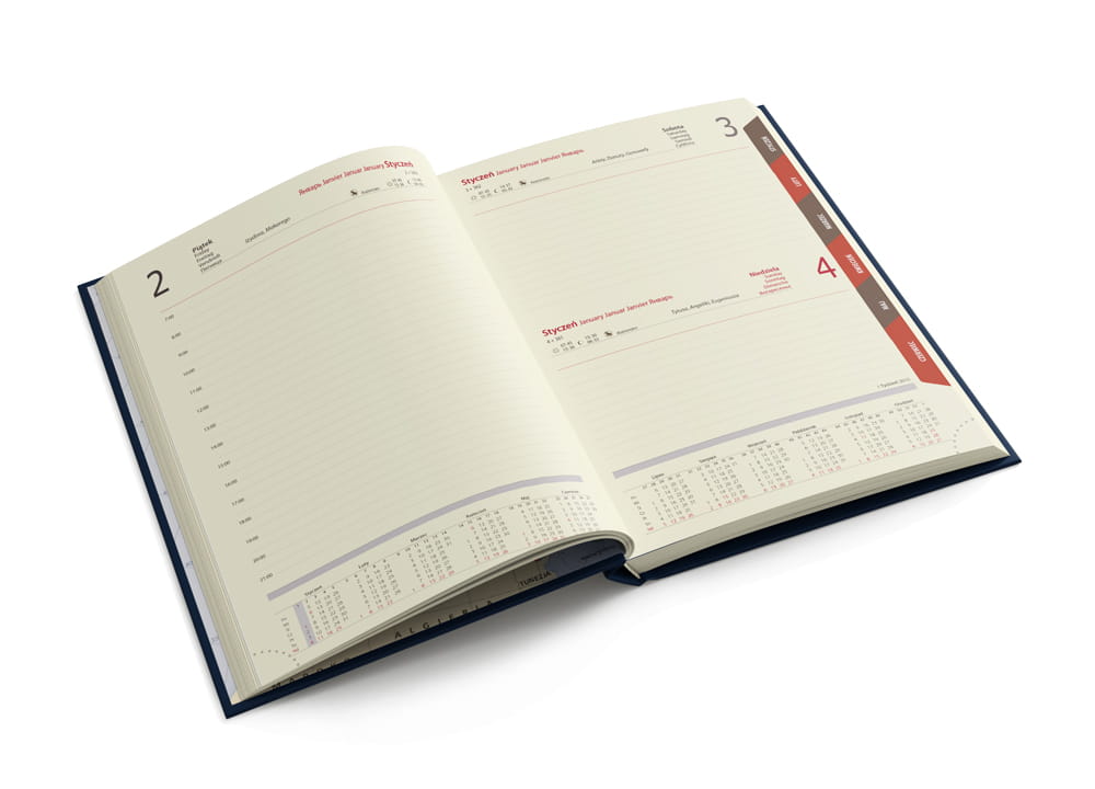 | układ | dzienny, 1 dzień na jednej stronie, sobota i niedziela na jednej stronie, przed każdym miesiącem terminarz miesięczny |