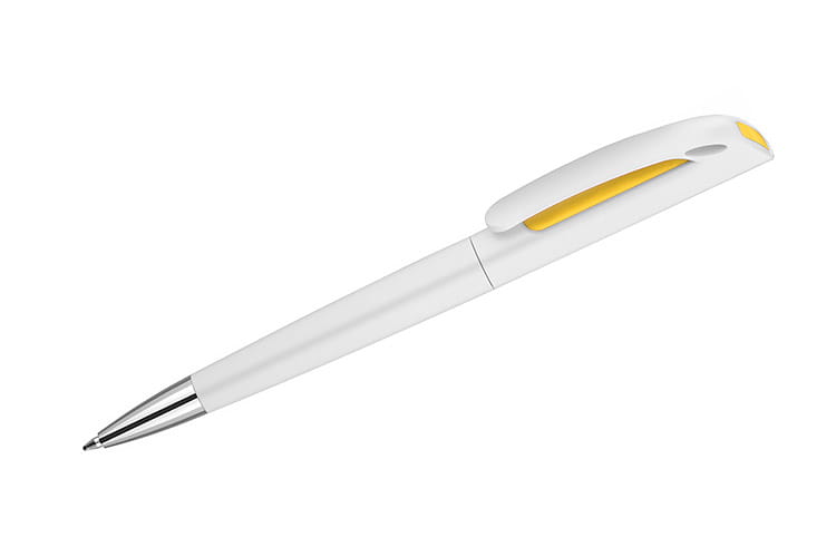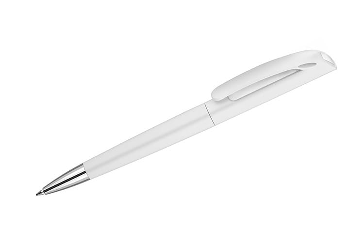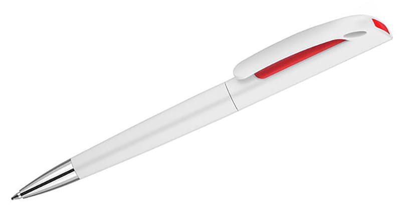 INTER to klasyczny długopis z tworzywa sztucznego. Korpus w białym kolorze z kolorowym zdobieniem pod klipem. Długopis typu twist. Wkład o grubości 0,7 mm w kolorze niebieskim.