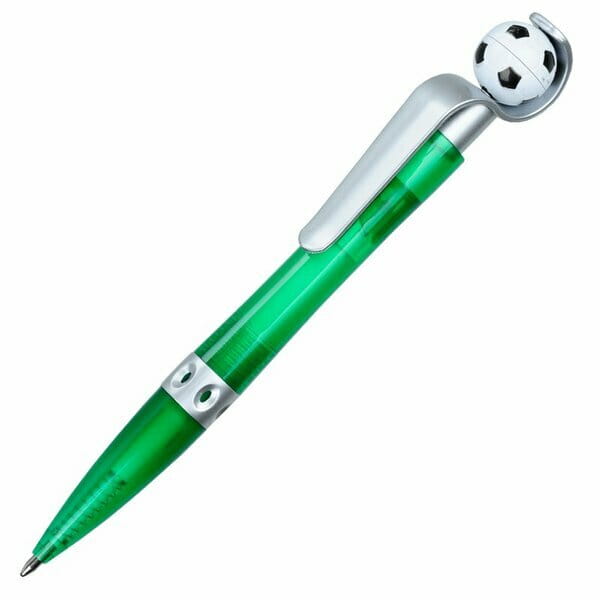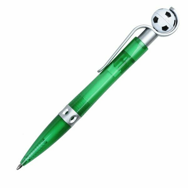 Długopis plastikowy z obrotową piłką. Doskonały gadżet dla kibiców piłki nożnej. Wyposażony w niebieski wkład.