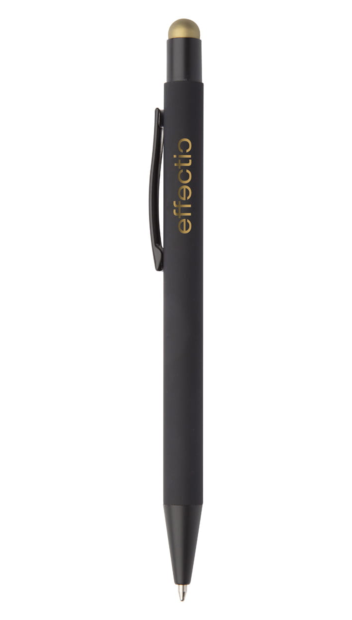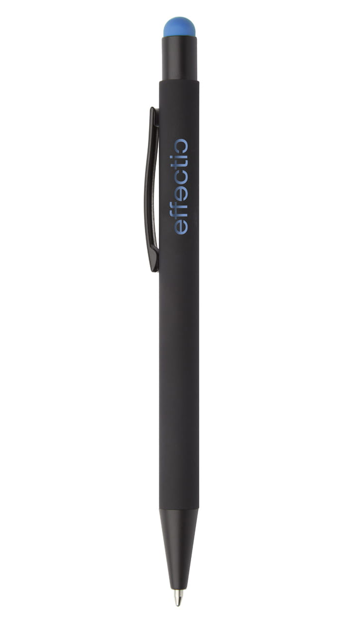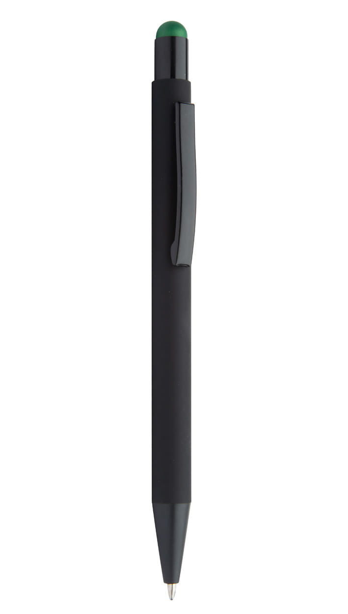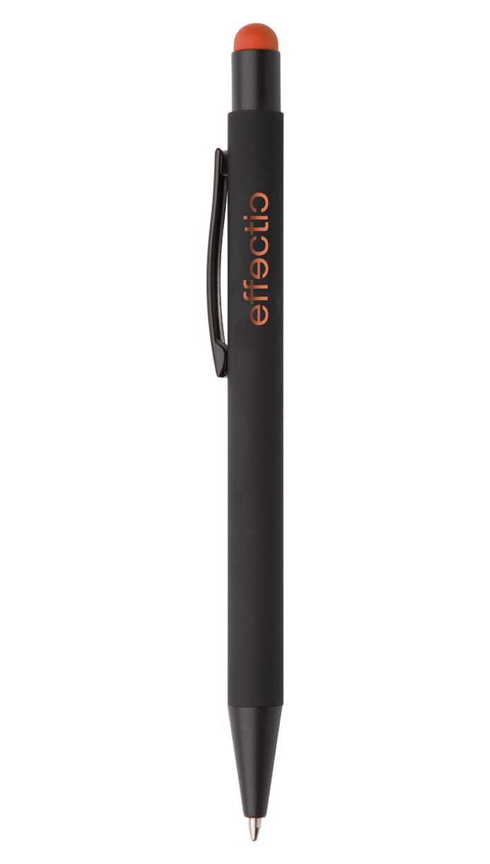 Aluminiowy długopis z końcówką do ekranów dotykowych i gumowanym wykończeniem. Posiada specjalną powłokę pod grawer lustrzany pasujący kolorystycznie do gumki.