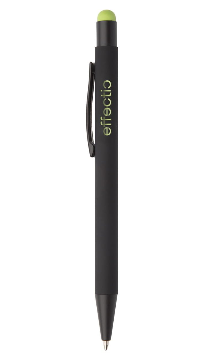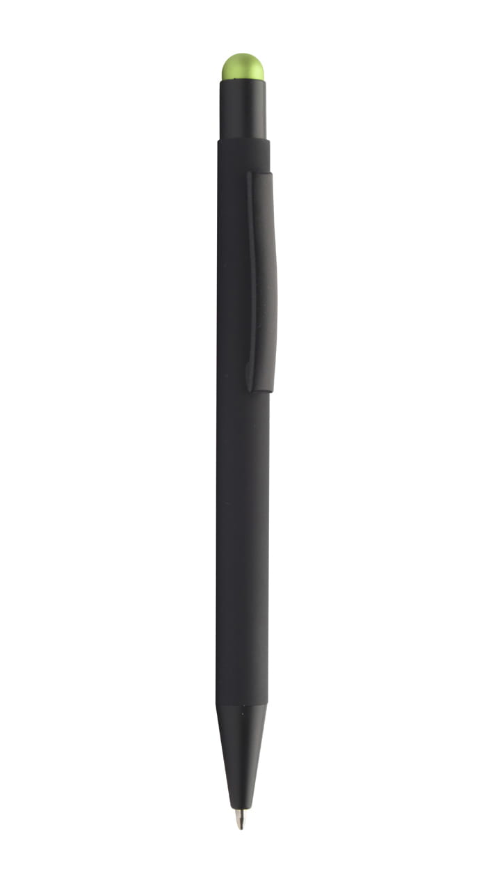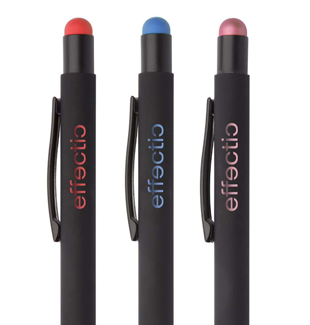 Aluminiowy długopis z końcówką do ekranów dotykowych i gumowanym wykończeniem. Posiada specjalną powłokę pod grawer lustrzany pasujący kolorystycznie do gumki.