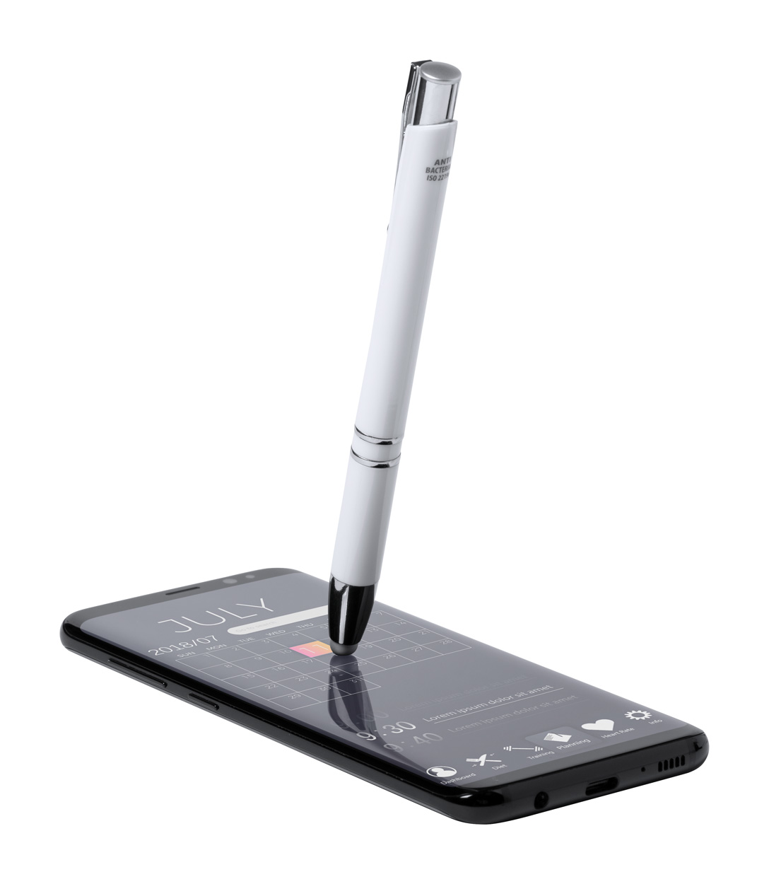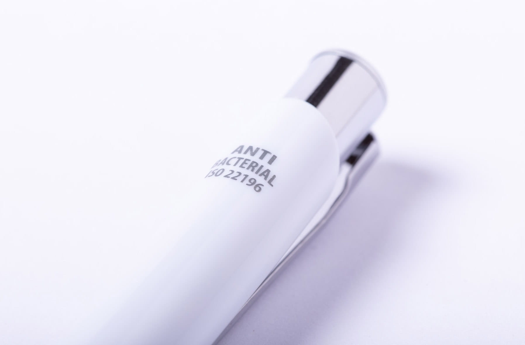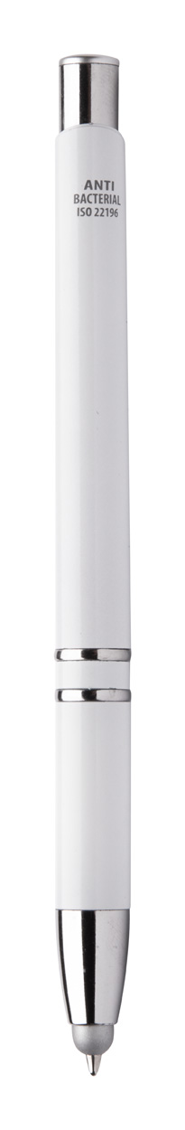 Antybakteryjny długopis z końcówką do ekranów dotykowych i niebieskim wkładem. Zgodny z ISO 22196.