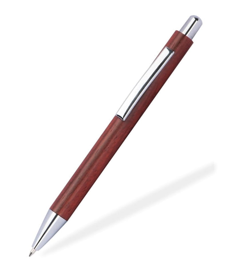 Długopis wykonany z drewna z niebieskim wkładem. Drewniany długopis posiada srebrne elementy i mechanizm z przyciskiem.