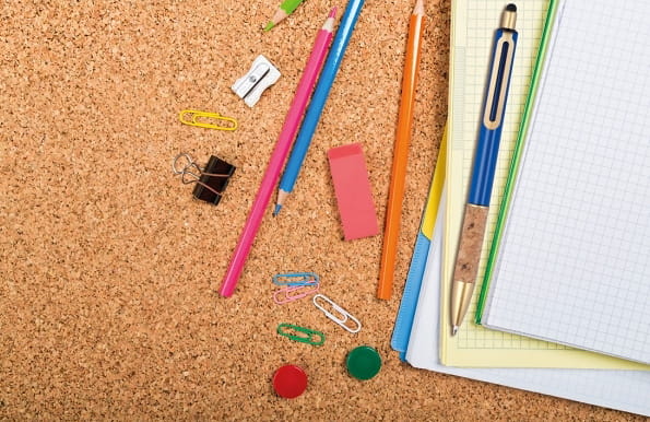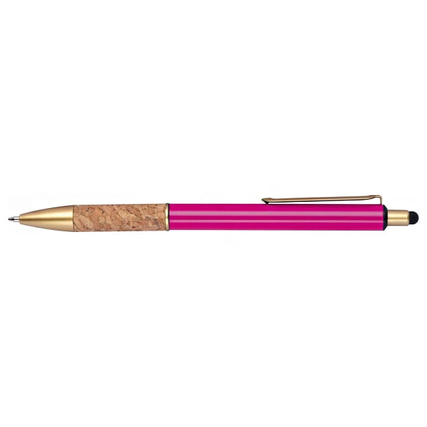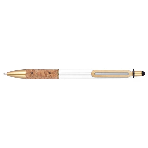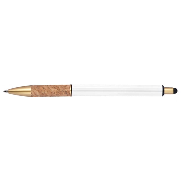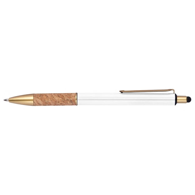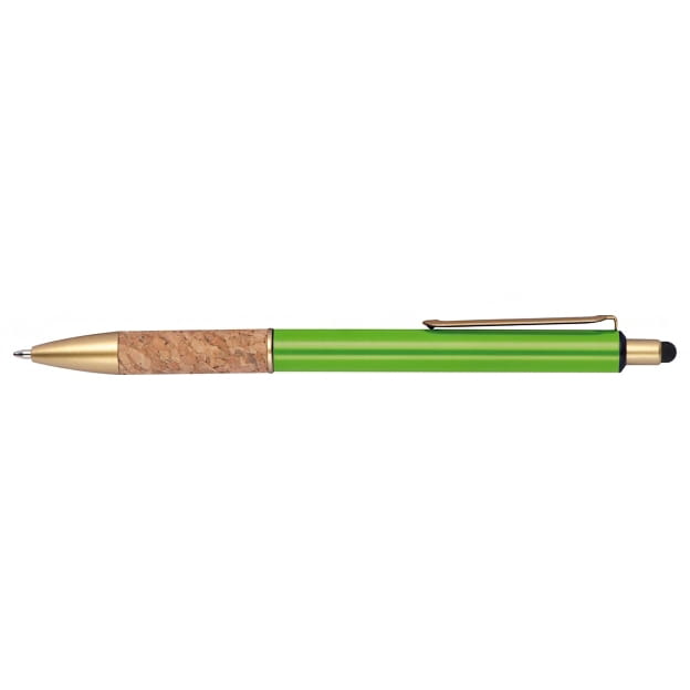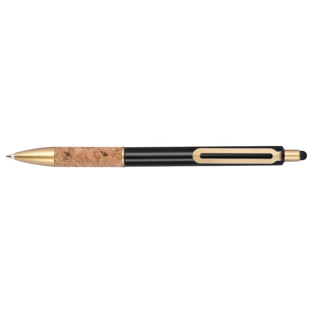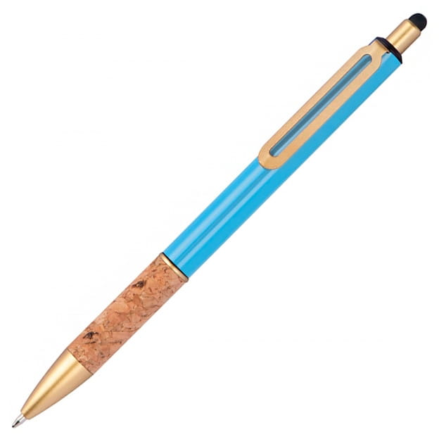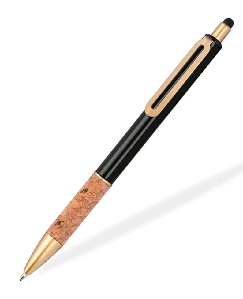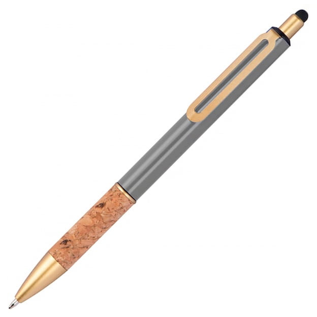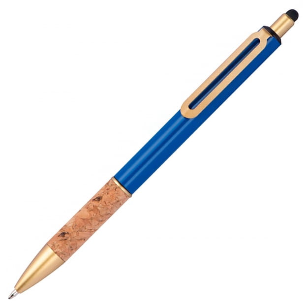 Metalowy długopis ze złotymi elementami i korkową strefą uchwytu. Długopis pisze na niebiesko.