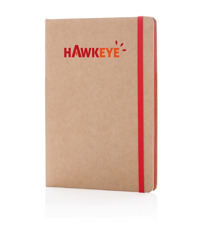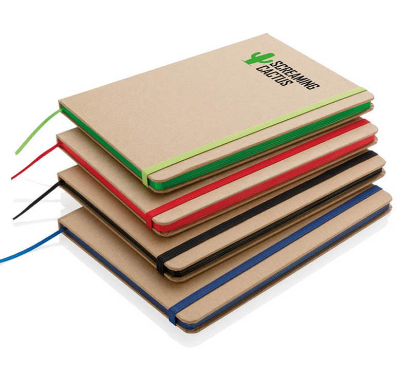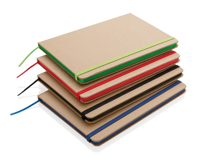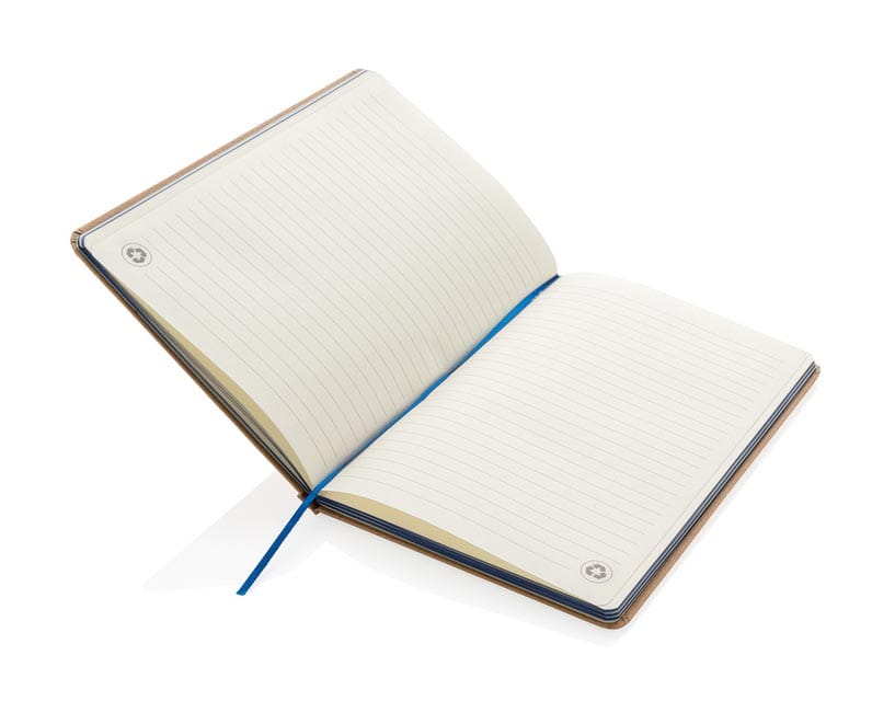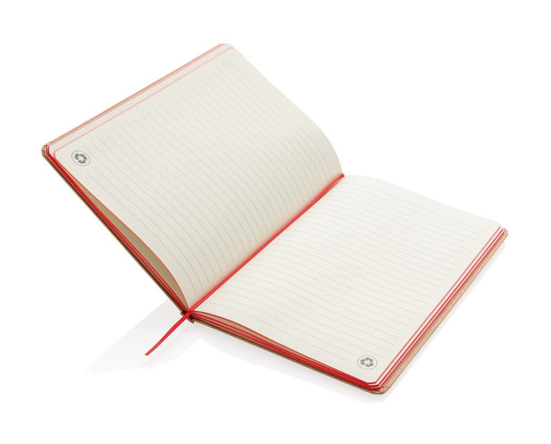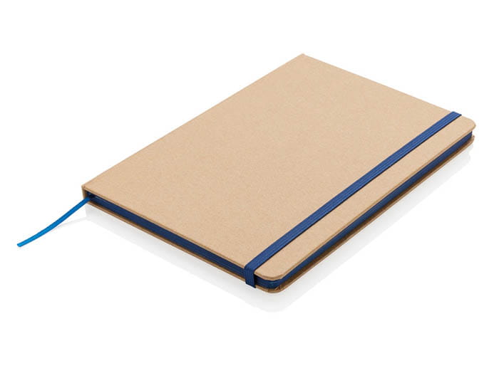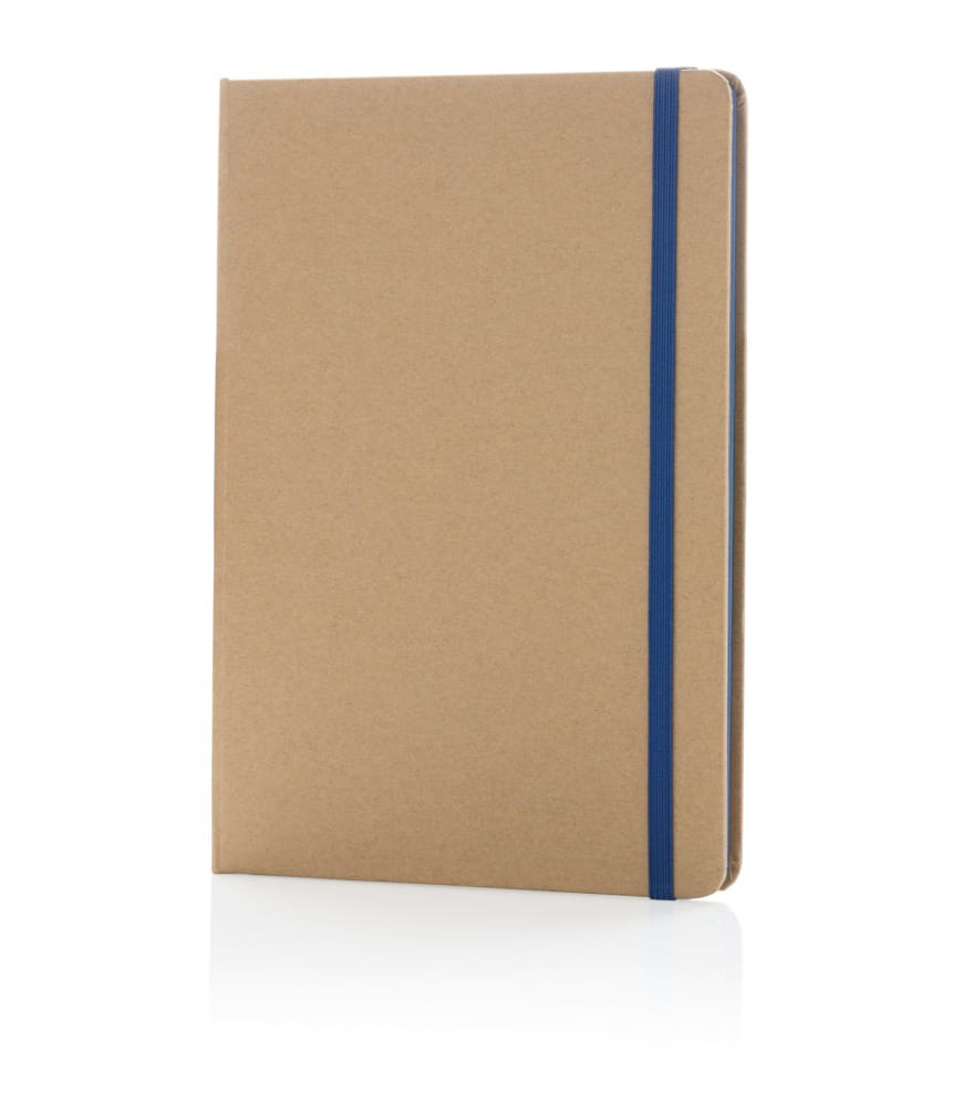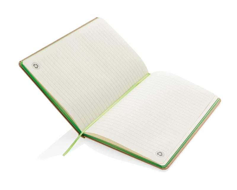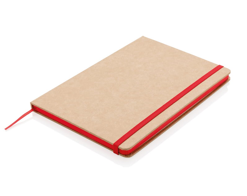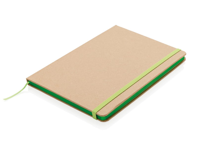 Ekologiczny notatnik A5 (72 kremowe kartki 70 g/m2 w linie), wykonany z papieru makulaturowego, tasiemka zakładkowa i elastyczna opaska do zamykania