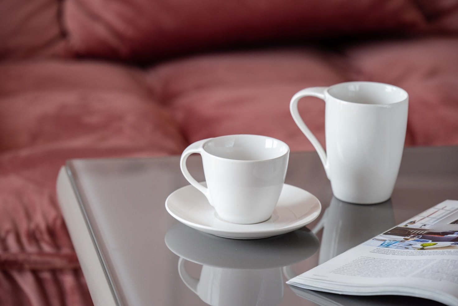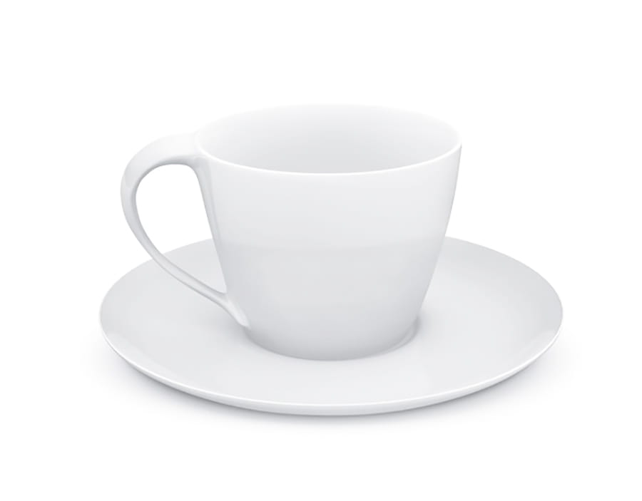 Biała filiżanka wykonana z porcelany z ciekawie wygiętym uszkiem.