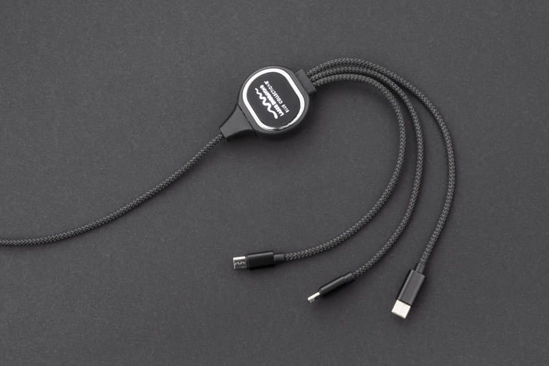Kabel posiada idealne miejsce na wygrawerowane logo, które podświetli się po podłączeniu kabla. Jest to kabel 3 w 1, co oznacza, że posiada końcówki: micro USB, USB typu C i Lightining (iPhone). Sam przewód powleczony jest wzmacnianym materiałem i ma długość ok. 1 m. Kabel służy wyłącznie do ładowania.