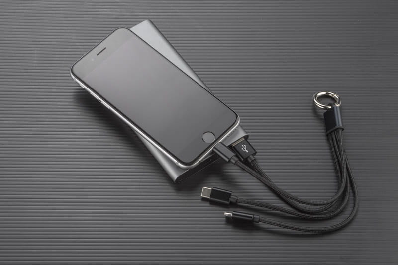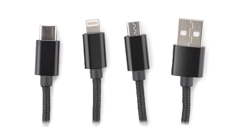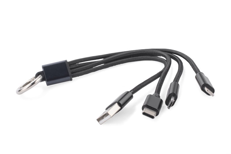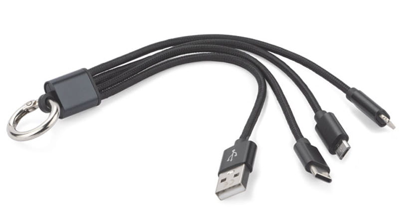 Kabel USB 3 w 1 do ładowania różnych urządzeń posiada trzy końcówki: micro USB, Lightning (iPhone) i USB typu C. Kabel jest powleczony tkaniną, a końcówki USB są wykonane z metalu. Praktyczny gadżet dla każdego użytkownika mobilnych urządzeń.