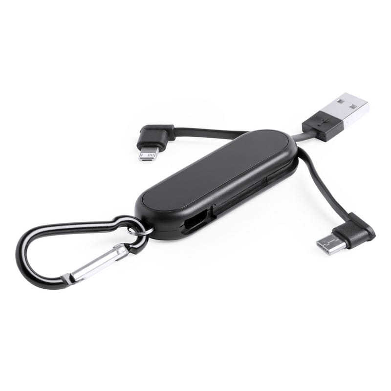 Kabel do ładowania z 3 końcówkami: USB, USB typu C oraz końcówką 2 w 1 (micro USB oraz kompatybilną z urządzeniami iOS), grawer ukazuje podświetlaną powierzchnię, 1 LED, z karabińczykiem (do użytku promocyjnego)