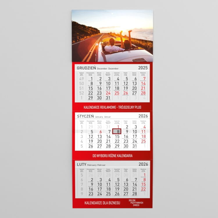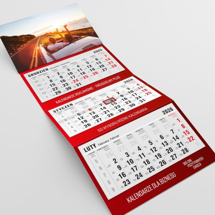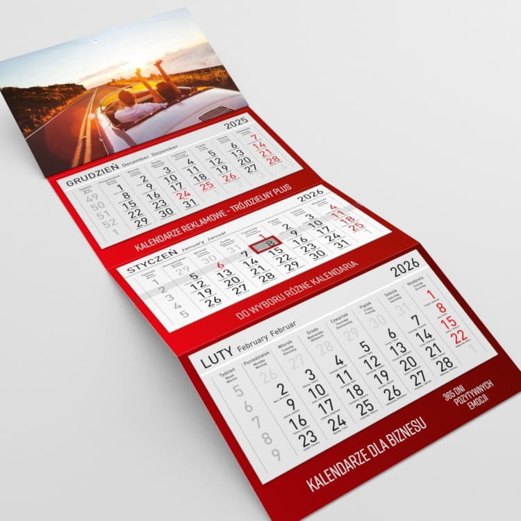 Ten model to starszy brat kalendarza trójdzielnego standard. Oba wykonane są z tych samych surowców, różnią się nieco wielkością. Umieść na nim dowolną grafikę reklamową.