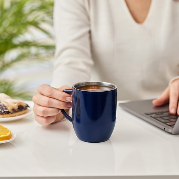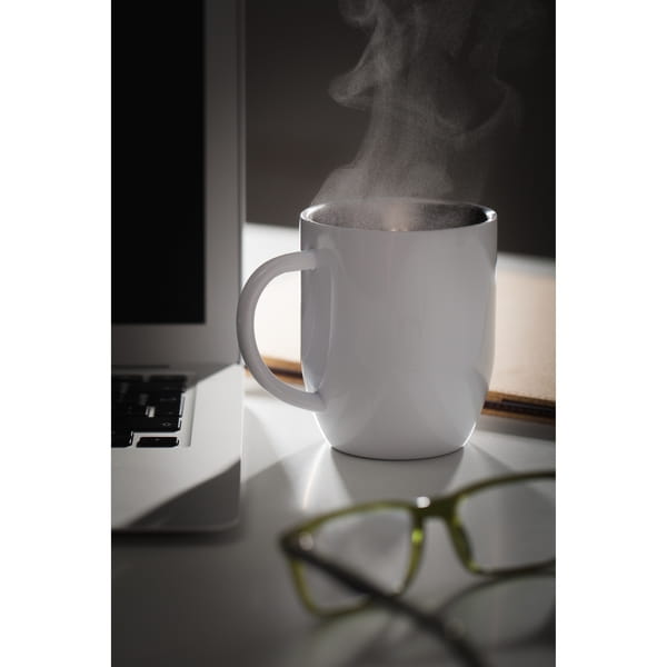 Kubek o pojemności 350 ml z dwiema ściankami ze stali nierdzewnej, wewnątrz kubka stal o podwyższonej jakości 18/8. Pokryty błyszczącym lakierem. Kształtem nawiązuje do kubków ceramicznych.