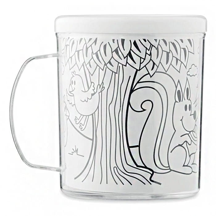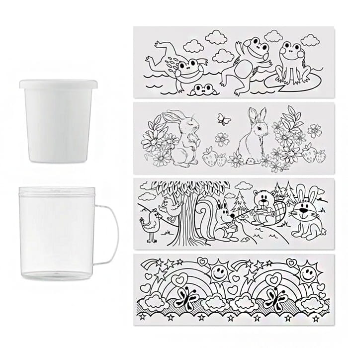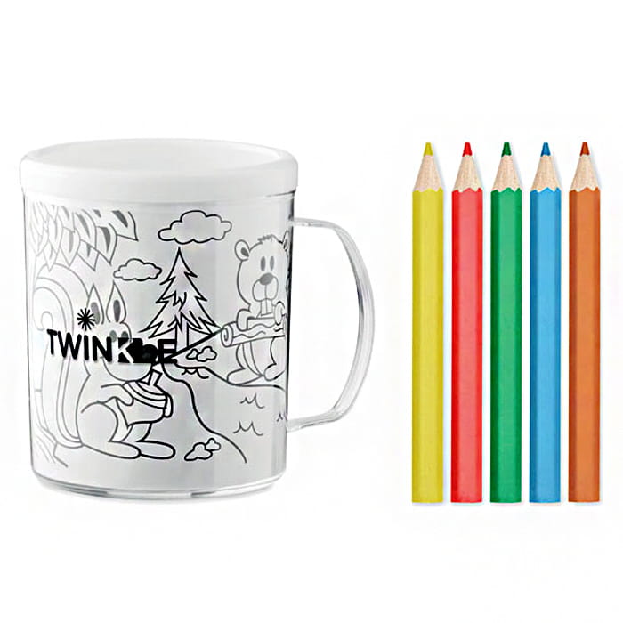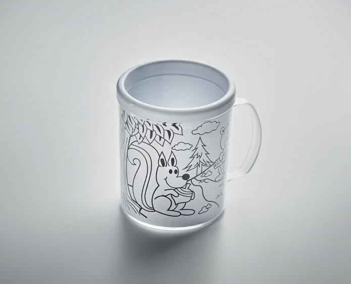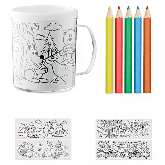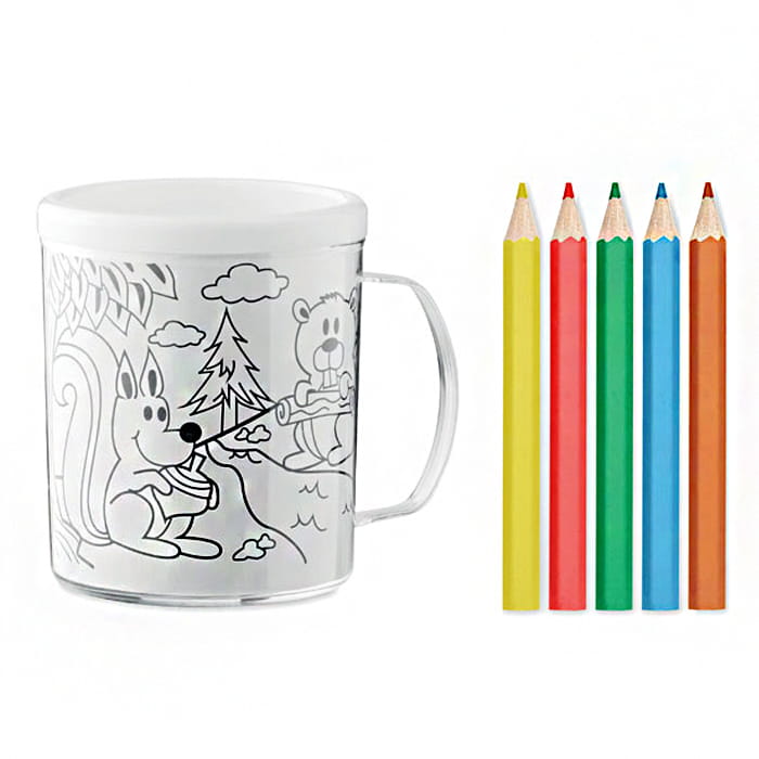 Kubek z tworzywa PS w zestawie z 5 kolorowymi kredkami, zawiera 4 wzory obrazków do kolorowania. Uwolnij swoją kreatywność i pokoloruj swój własny kubek. Kubek zawiera 5 kredek w kolorach: żółty, czerwony, zielony, niebieski i pomarańczowy