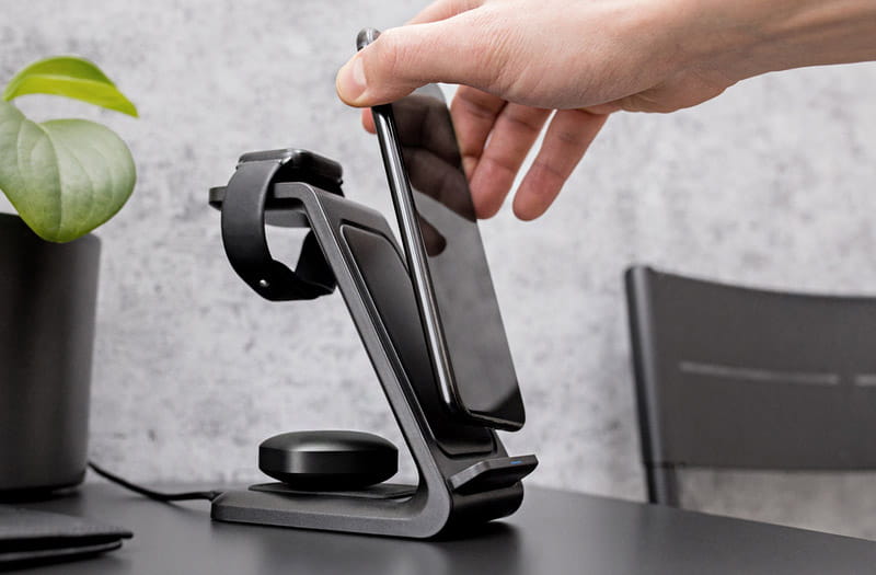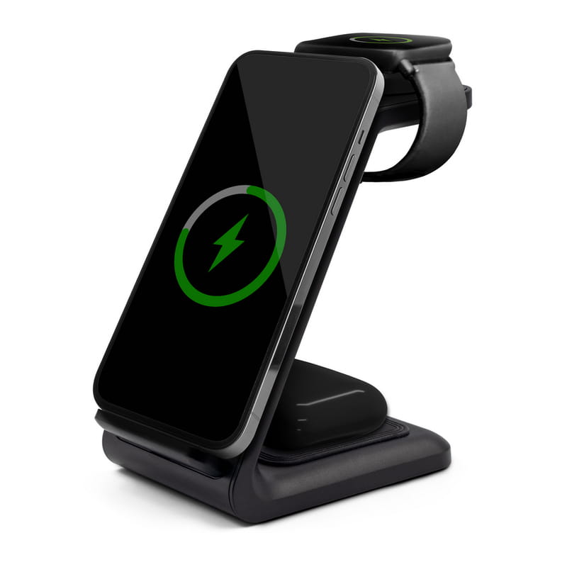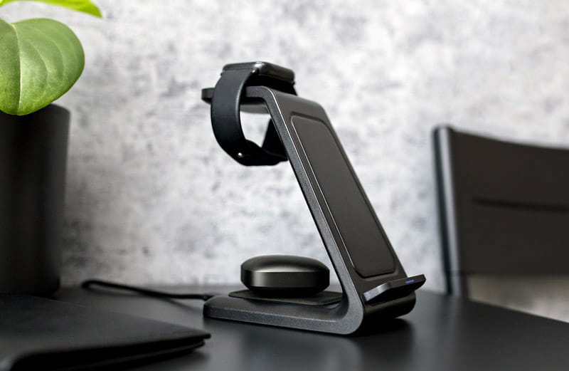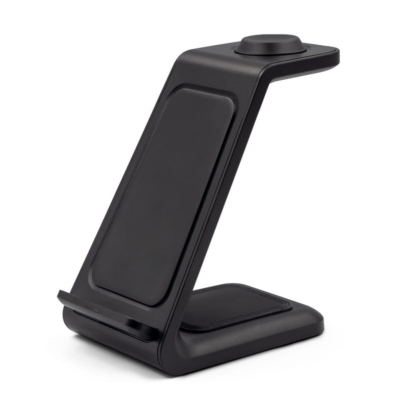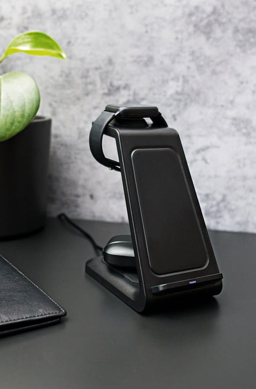 Ładowarka bezprzewodowa 15W, 3 w 1, stojak na telefon, działa z telefonami posiadającymi możliwość ładowania indukcyjnego, 3 cewki ładowania bezprzewodowego (15W, 3W, 2W), możliwość ładowania trzech urządzeń jednocześnie, wejście USB typu C, kabel USB typu C w komplecie.