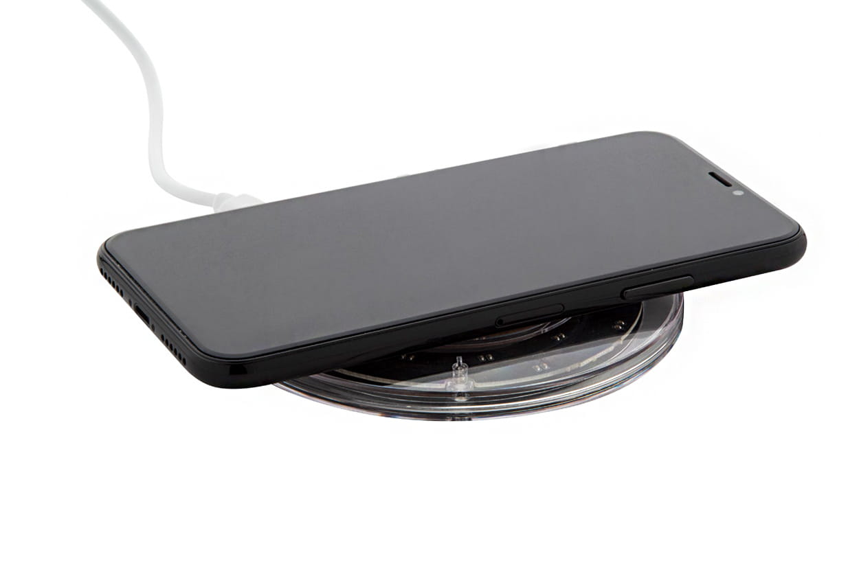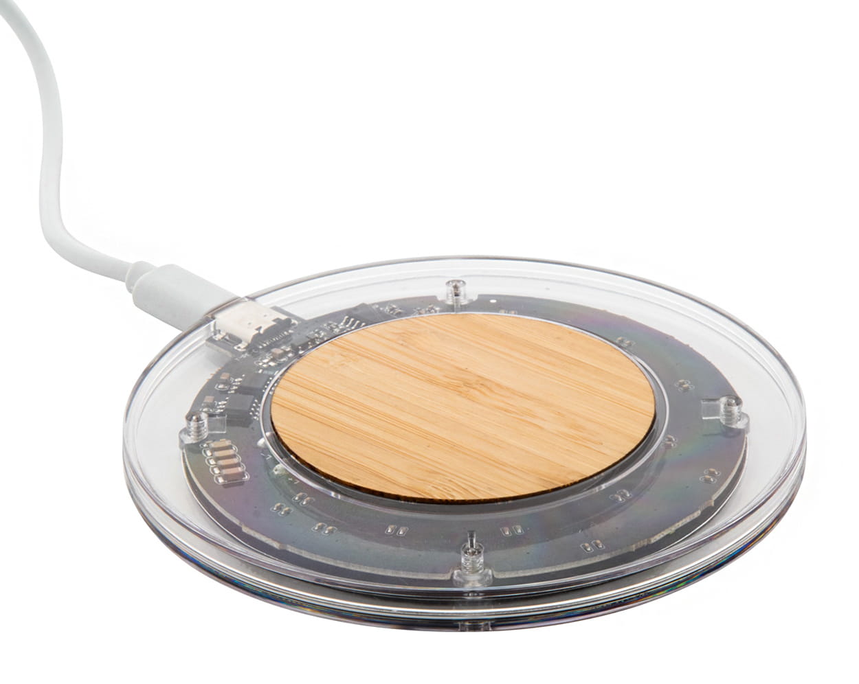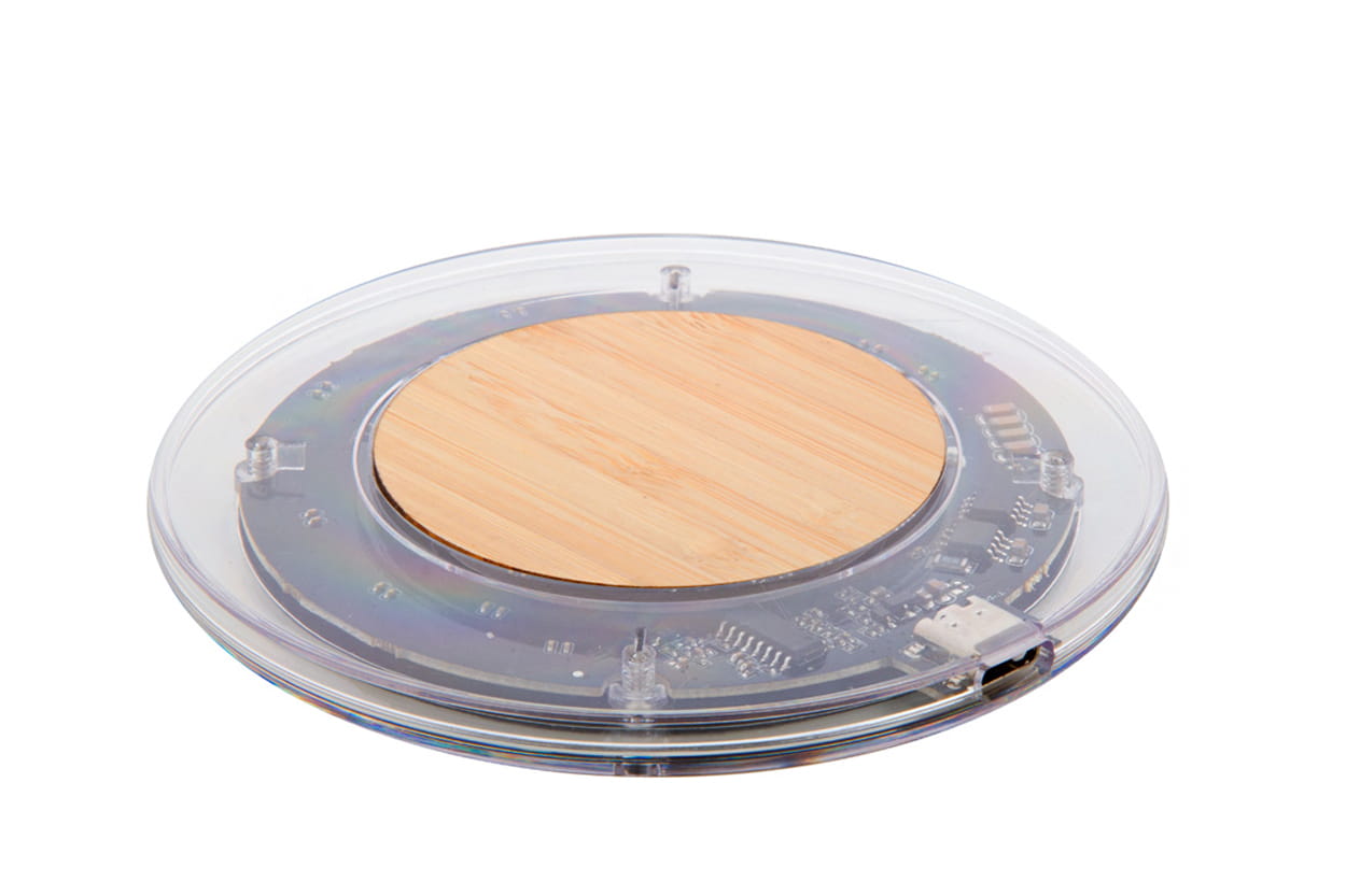Szybka ładowarka indukcyjna (15W) w przezroczystej obudowie z plastikuj i bambusa z widocznymi elementami elektronicznymi. Zawiera kabel USB.