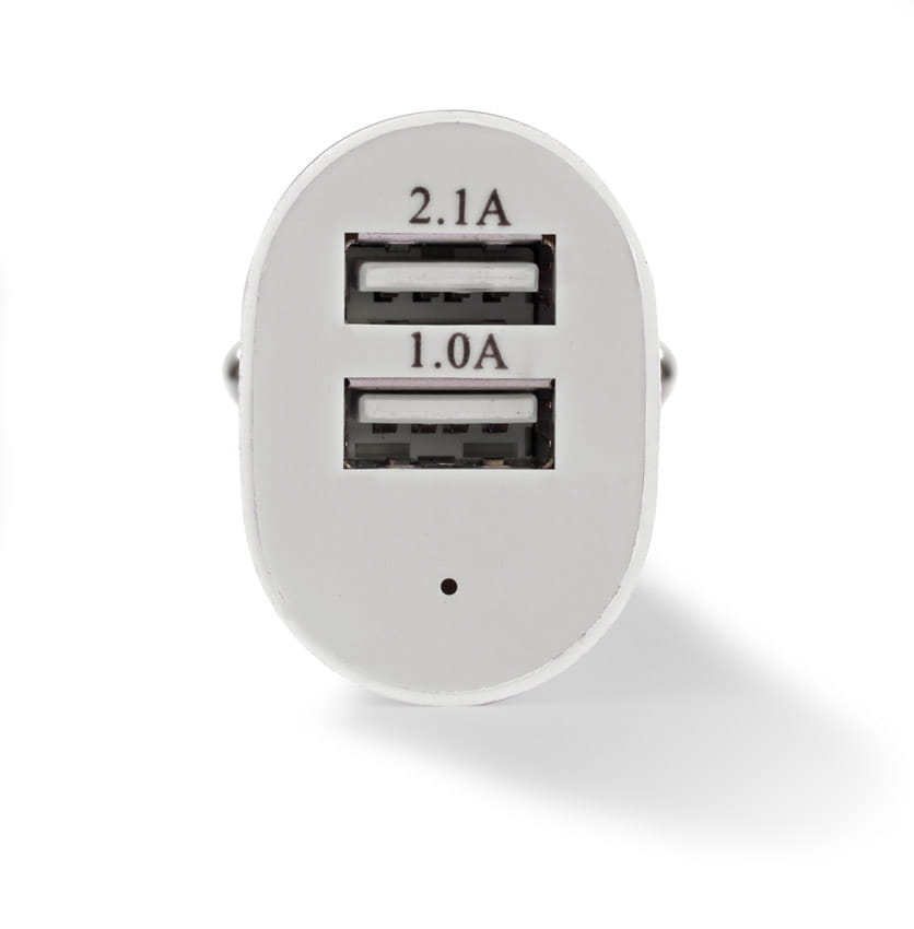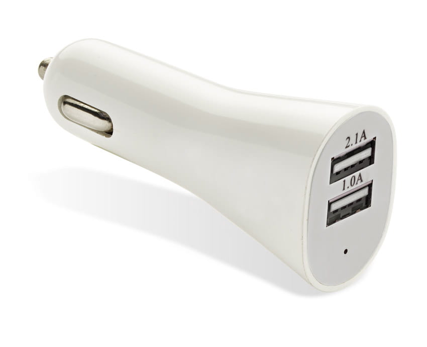 Ładowarka samochodowa o opływowym kształcie pozwalająca na ładowanie dwóch urządzeń mobilnych jednocześnie przez porty USB. Posiada diodę sygnalizującą ładowanie. Parametry: moc wejścia 12V, moc wyjścia 5V/2.1A + 1A.