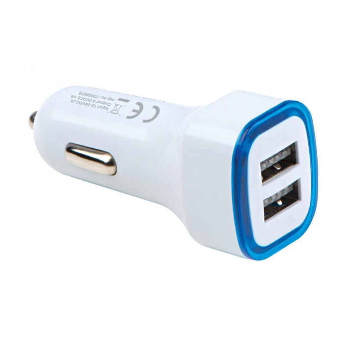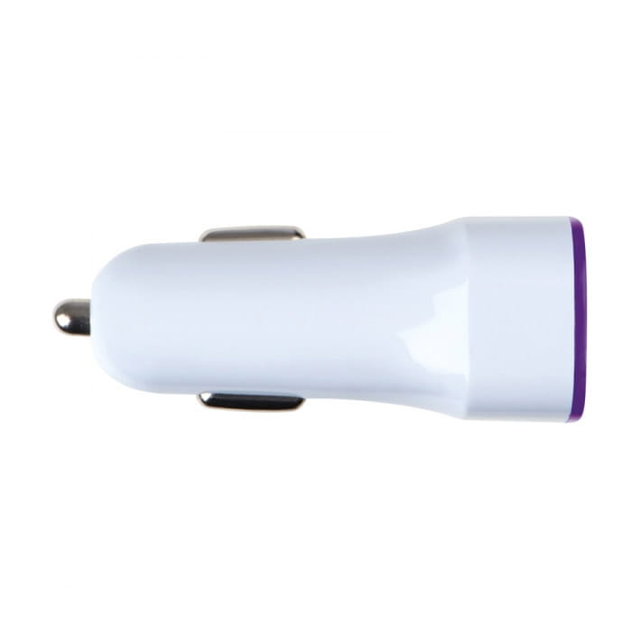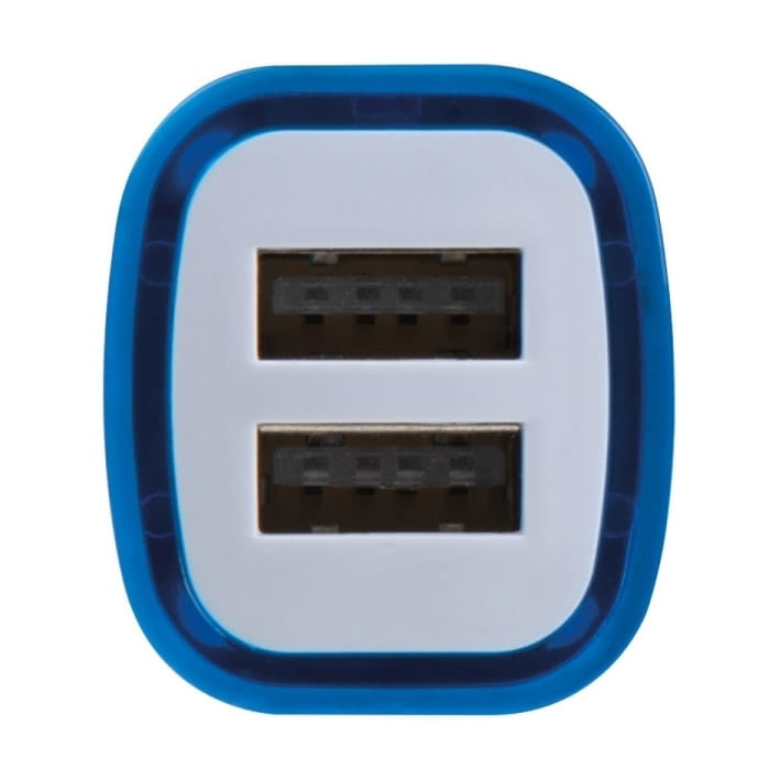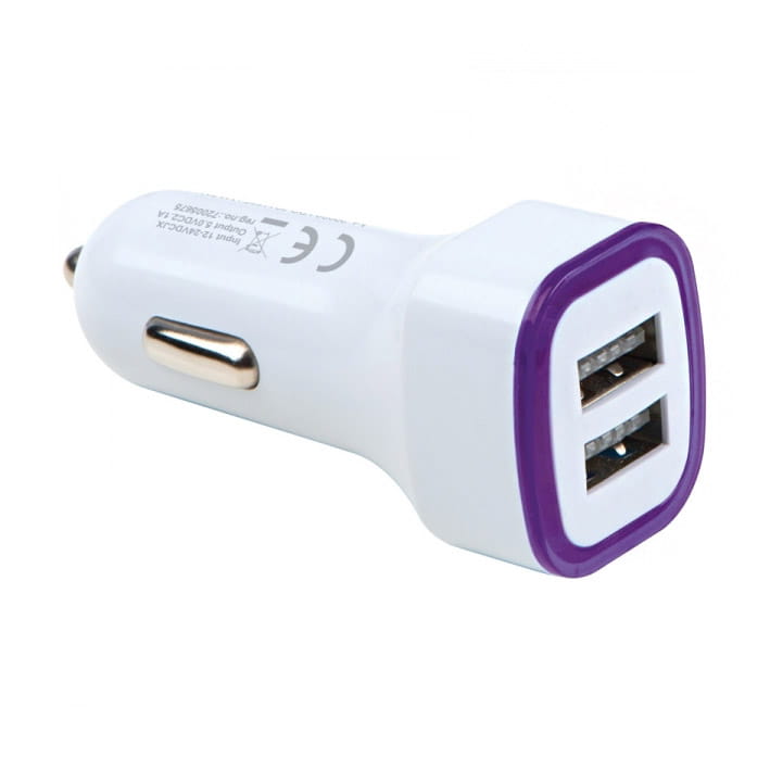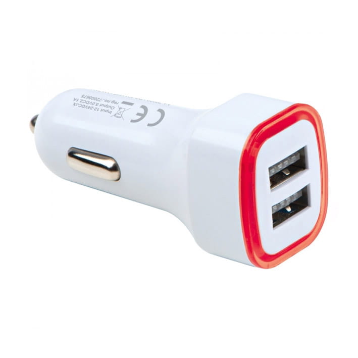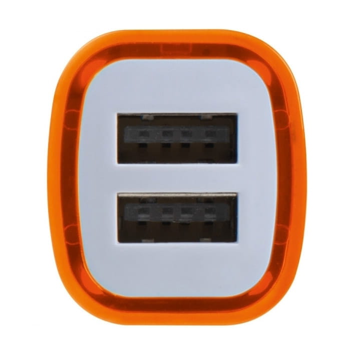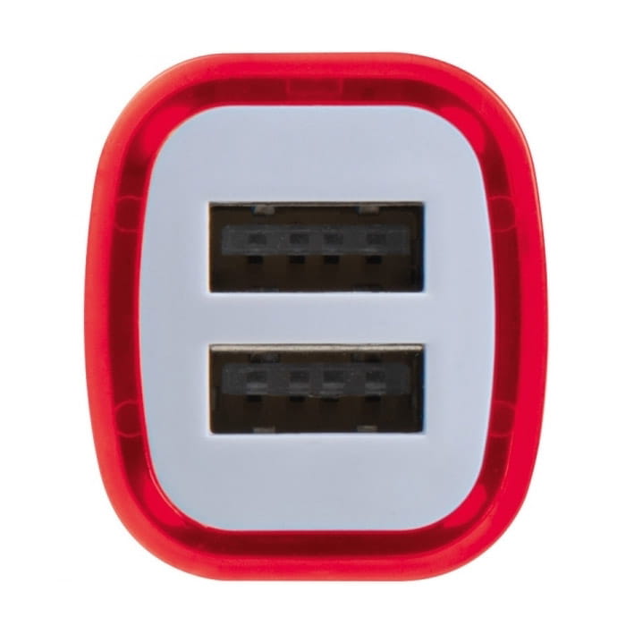 Ładowarka samochodowa USB z dwoma wejściami USB, podłączana do zapalniczki samochodowej. Wykonana z metalu i plastiku. Dostępna w kilku soczystych kolorach.