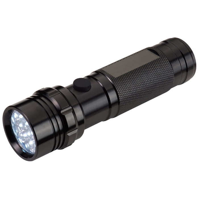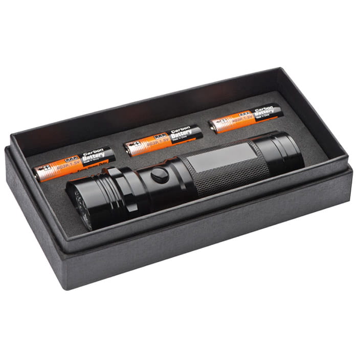 Metalowa latarka w kolorze czarnym. Dzięki zastosowaniu na obudowę najwyższej klasy materiałów jest ona bardzo wytrzymała i odporna na działanie czynników zewnętrznych. Zasilanie poprzez trzy baterie AAA do tego zastosowane najwyższej klasy diody w ilości 14 sztuk sprawiają, że świeci ona bardzo mocnym, jasnym światłem przez bardzo długi czas. Z uwagi na niewielkie kształty zmieści się ona w każdym schowku samochodowym lub plecaku. Latarka zapakowana w szare ekologiczne pudełko. Zestaw zawiera również baterie.