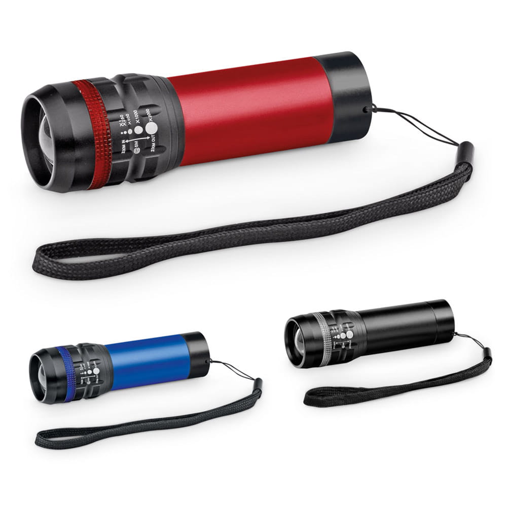 Aluminiowa latarka z funkcją zoomu z 3 trybami świecenia, lampką LED 1 W i uchwytem. Zawiera 3 baterie AAA. Dostarczana w pudełku prezentowym.