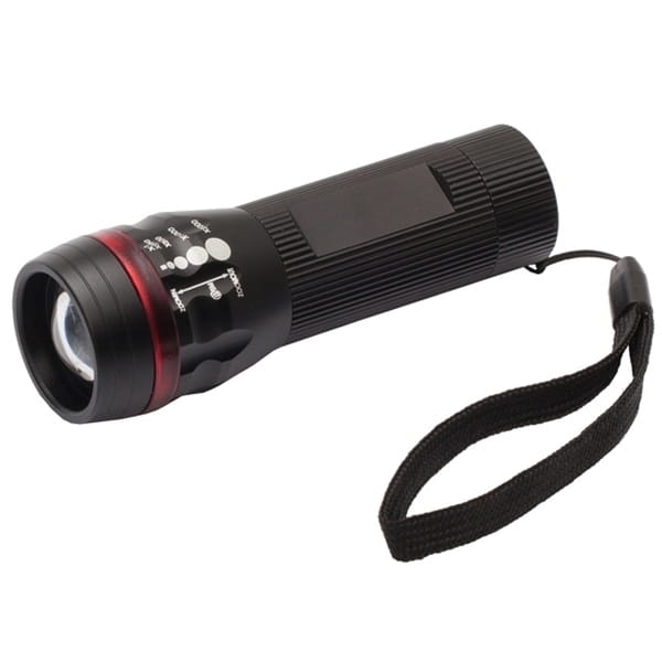 Latarka o strumieniu światła 230 lumenów, amerykańska dioda CREE XPE (3 W). Funkcja zoom. 3 tryby świecenia: mocny, optymalny (oszczędzający baterię), migający. Dołączone nylonowe etui. Zasilana 3 bateriami AAA (w cenie produktu). Żywotność LED 100 000 godz. Zasięg 80 metrów. Znakowanie logo: grawer laserowy