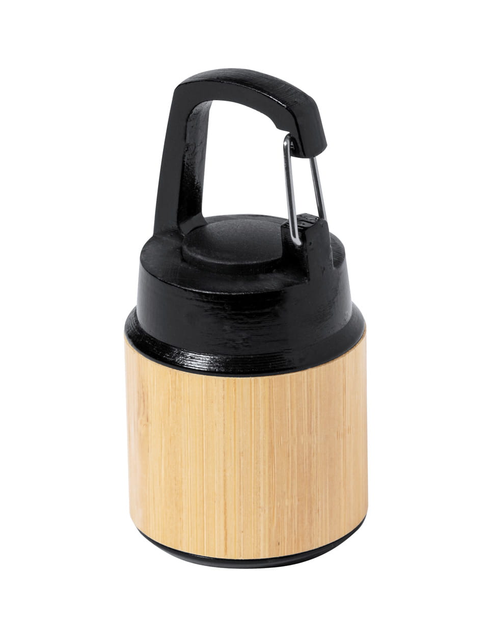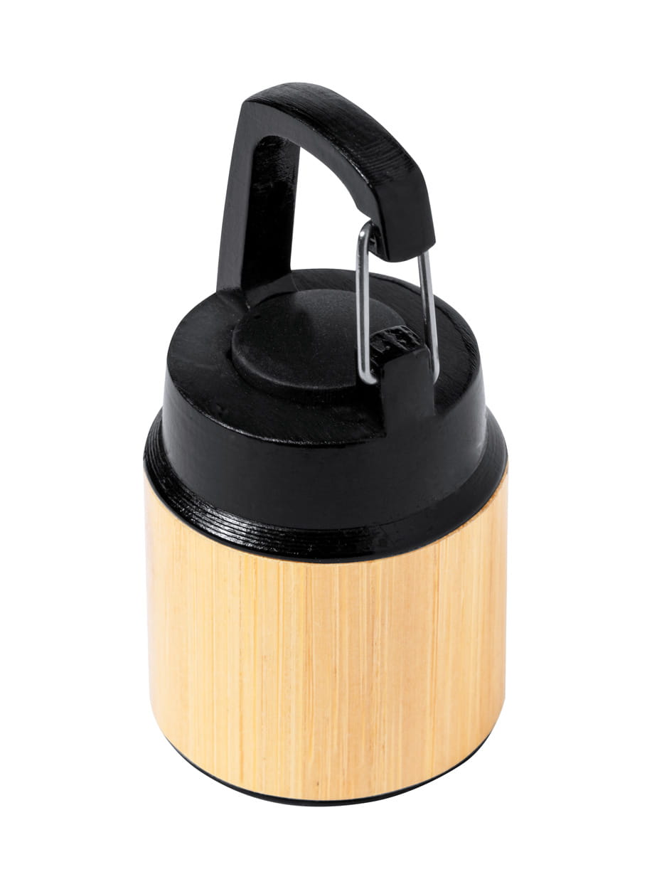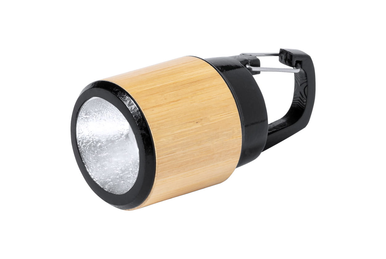 Plastikowa latarka ABS pokryta bambusem z diodą COB i karabińczykiem. W zestawie baterie guzikowe.