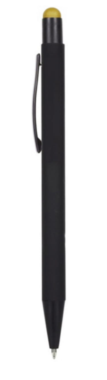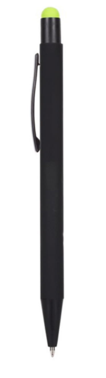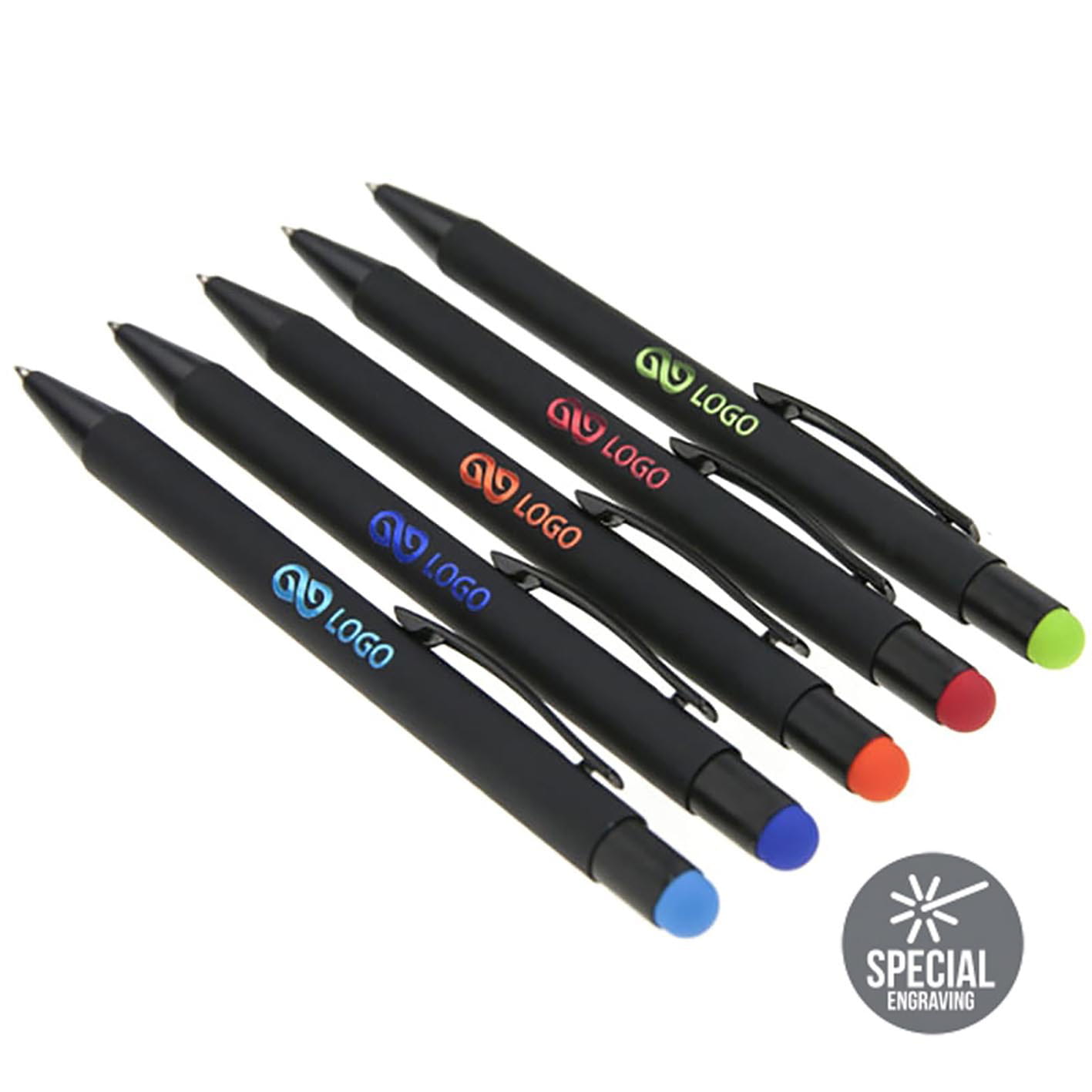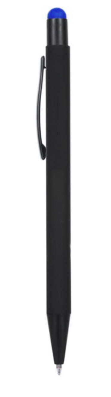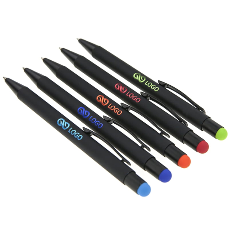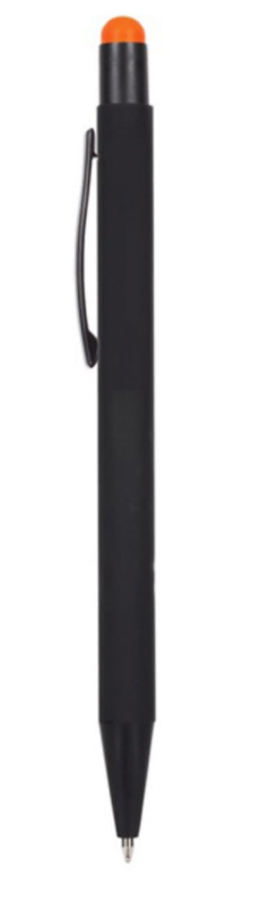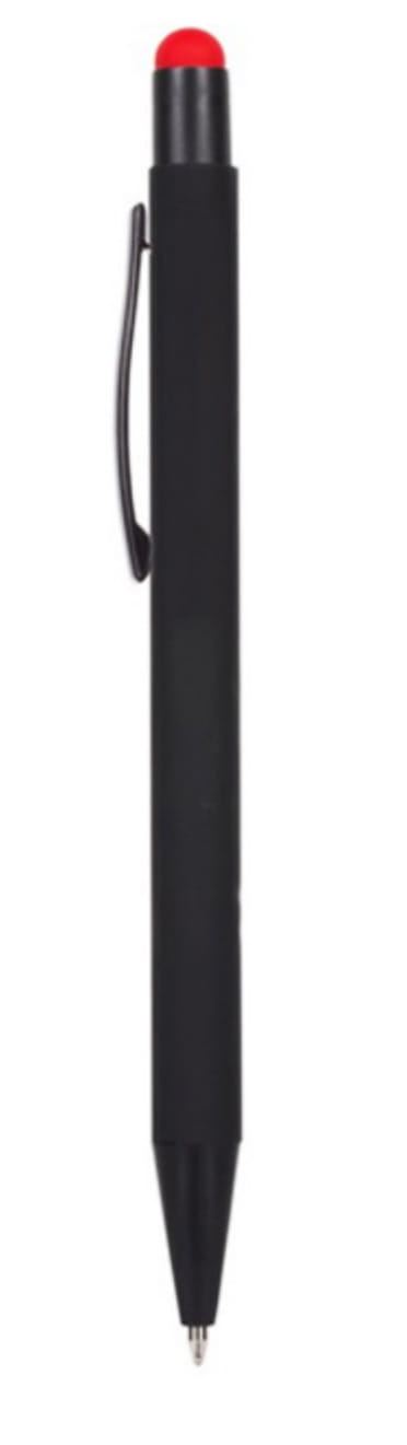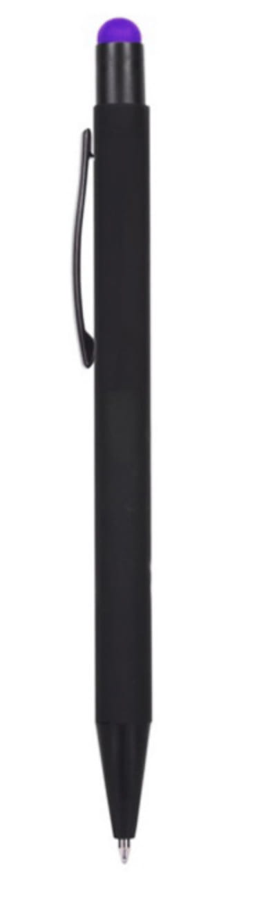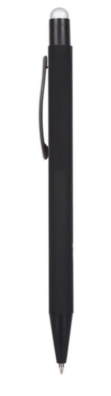 Długopis metalowy touch pen z błyszczącym kolorowym grawerem. Czarny korpus z czarnymi dodatkami i kolorową gumką do obsługi ekranów dotykowych.