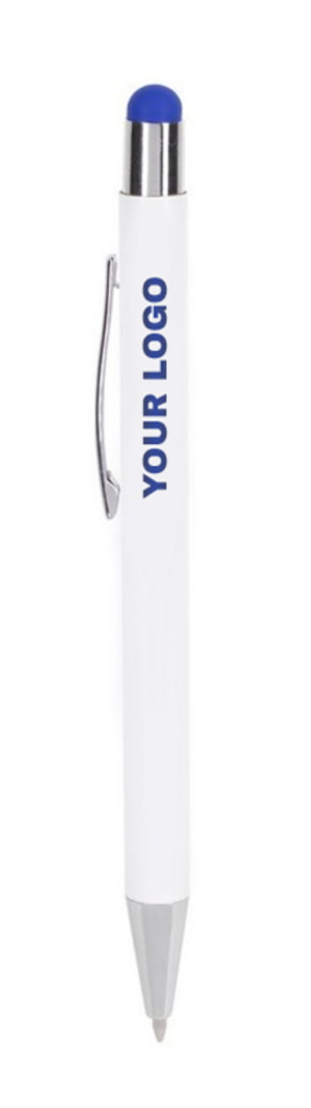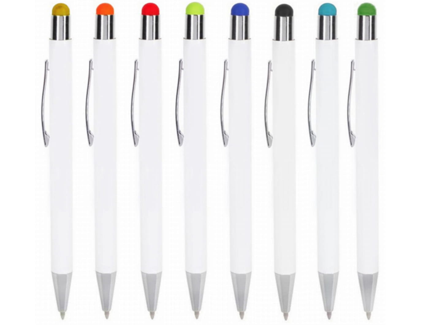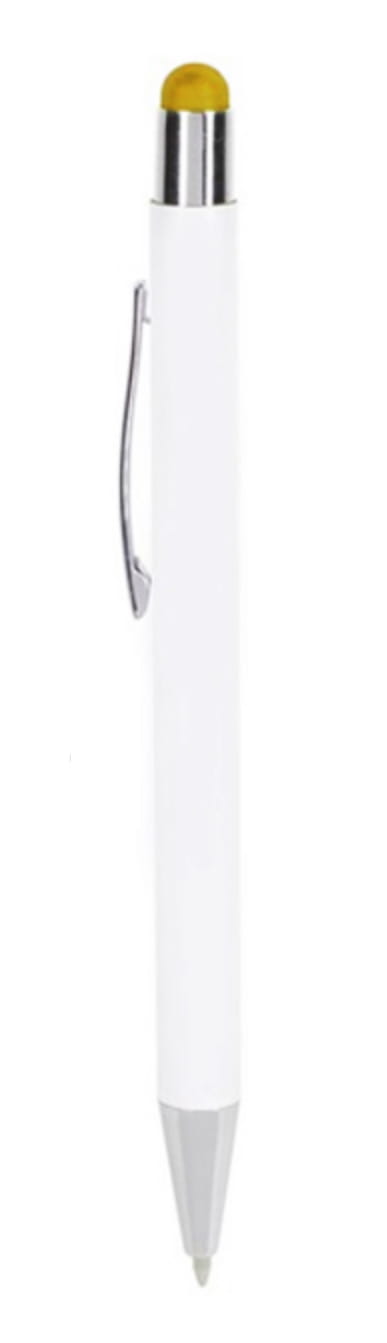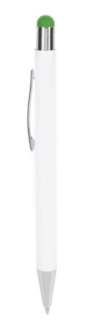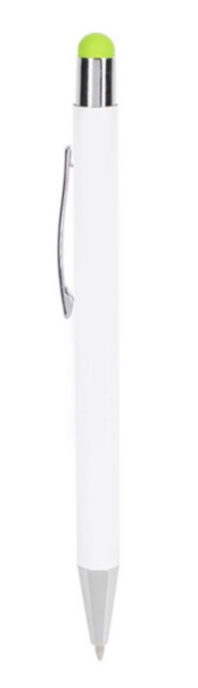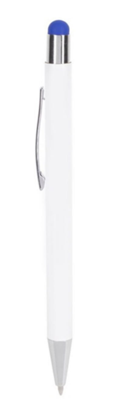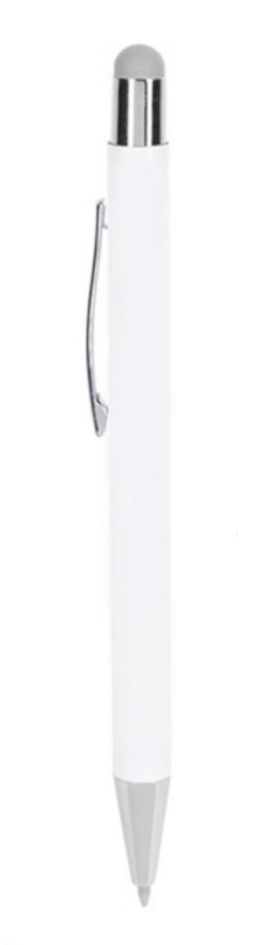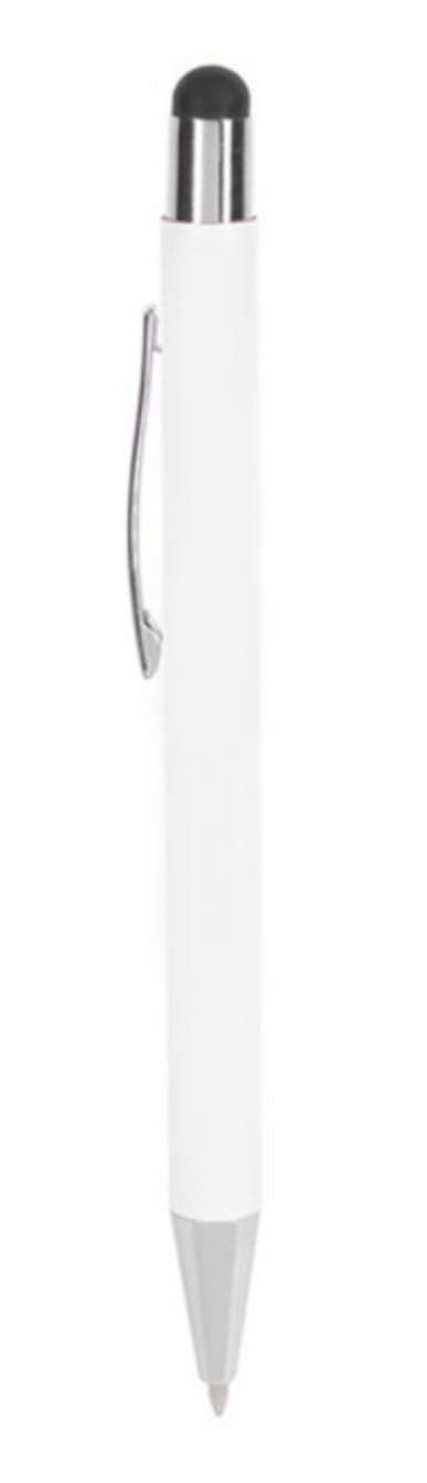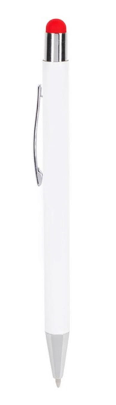 Długopis metalowy, touch pen. Biały korpus z chromowanymi dodatkami i kolorową gumką do obsługi ekranów dotykowych. Waga: 18 g