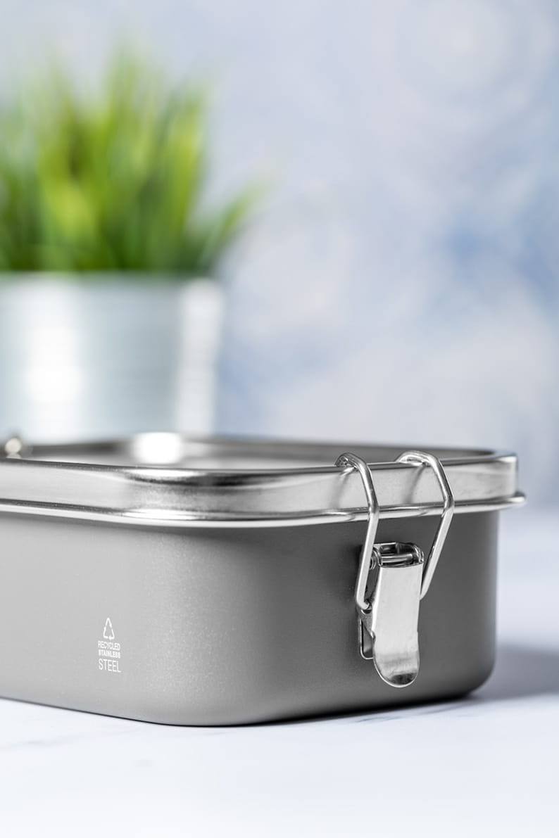 Pudełko na lunch ze stali nierdzewnej z recyklingu, z kolorowym obudową, kontrastową pokrywką i bezpiecznym zamknięciem na klamry, 750 ml.