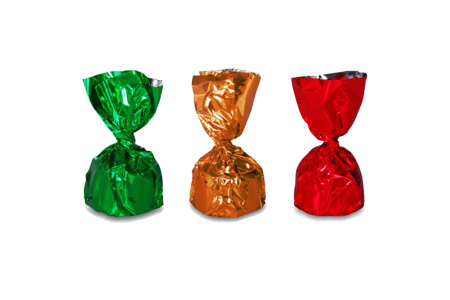 Zawartość: czekoladowe praliny z nadzieniem o smaku: wiśniowym (czerwona owijka), orzechowym (zielona owijka), karmelowo-arachidowym (miedziana owijka) / 15 sztuk