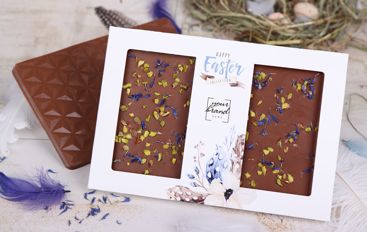 • tabliczka czekolady belgijskiej obsypana drobinkami pistacji i płatkami chabru