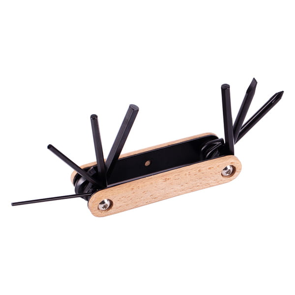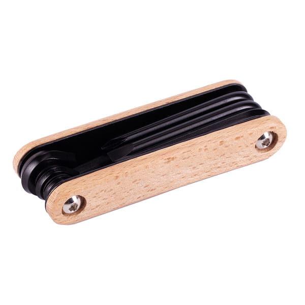 Stylowe, składane, narzędzie wielofunkcyjne w drewnianej oprawie. W jego skład wchodzą: 4 klucze imbusowe, 1 wkrętak płaski, 1 wkrętak krzyżakowy.