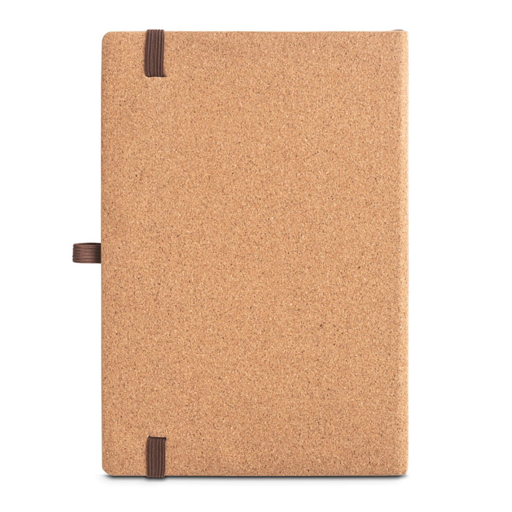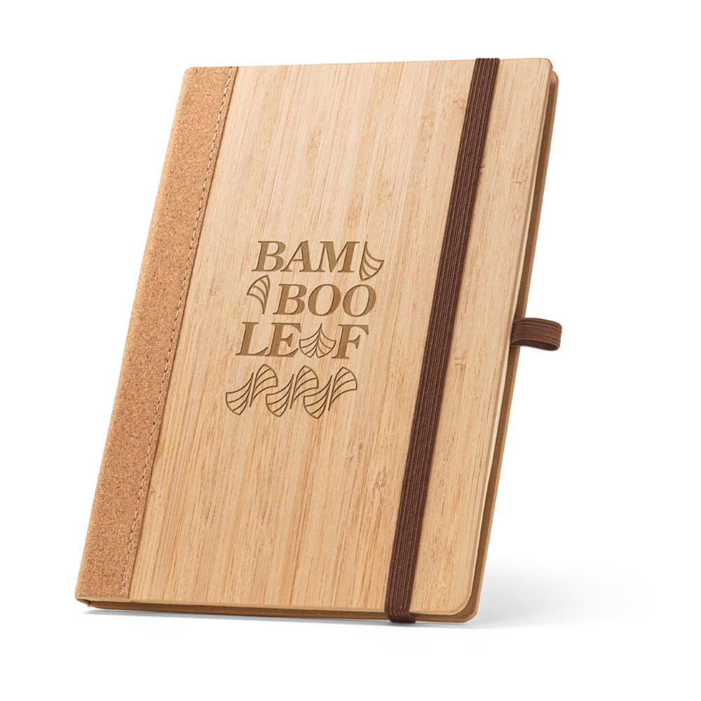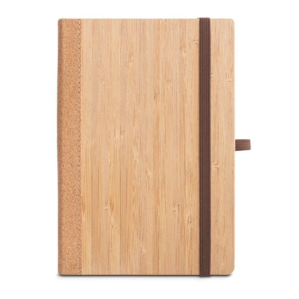 Notatnik A5 ze sztywną okładką z bambusa i arkuszami z korka. Zawiera 160 kartek wykonanych w 100% z papieru z recyklingu w kolorze kości słoniowej, kartki w linie, pasek rozdzielający, gumkę i uchwyt na długopis (długopisu nie ma w zestawie).