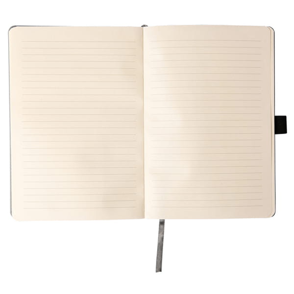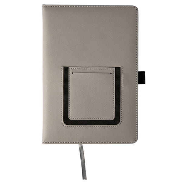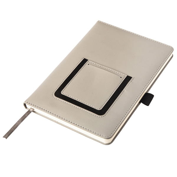 Notes A5 wyposażony w elastyczną kieszeń, która dopasowuje się do wielkości telefonu. Mniejsza kieszonka przeznaczona jest na wizytówki. Twarda oprawa z ekoskóry. 100 kartek w linię, gramatura 80 g/m2. Elastyczny uchwyt na długopis.