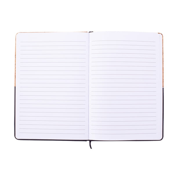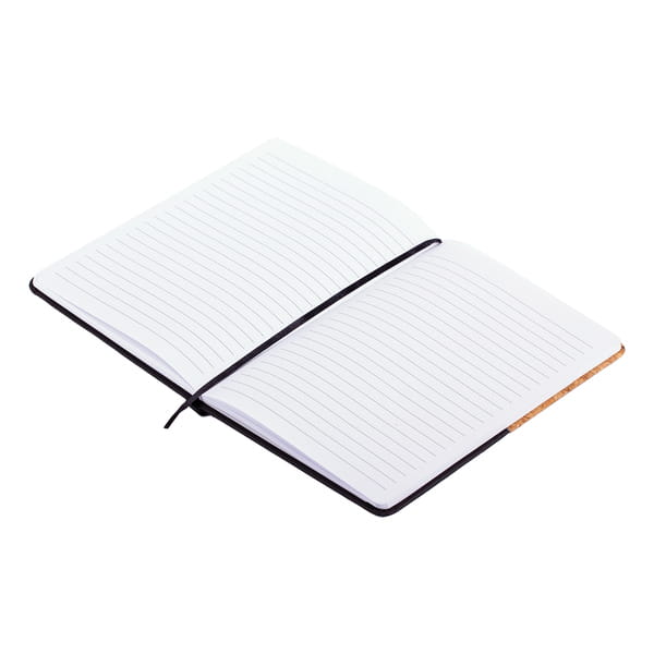 Stylowy notes w twardej oprawie łączącej naturalny korek z eleganckim PU. Rozmiar biurkowy (zbliżony do A5 lub większy). 80 kartek w linie, gramatura papieru 70 g/m2. Zamykany elastyczną taśmą. Dostępna opcja zdobienia full color (druk UV).