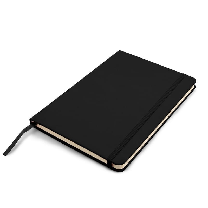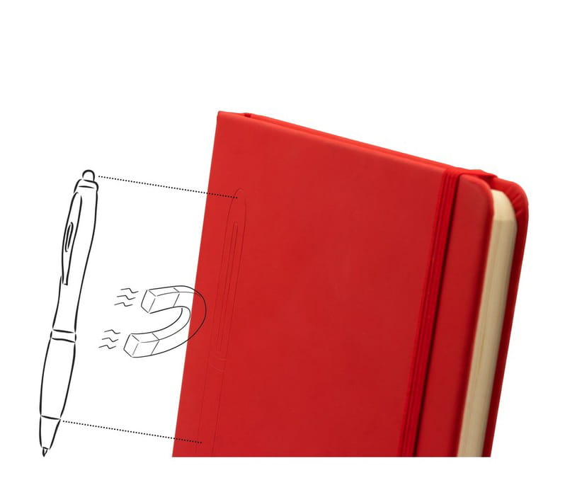 Notatnik A5 (80 kartek w linie), twarda okładka z PU z wbudowanym magnesem umożliwiającym przyczepienie przyborów do pisania (nie dołączone), tasiemka zakładkowa i elastyczna opaska do zamykania
