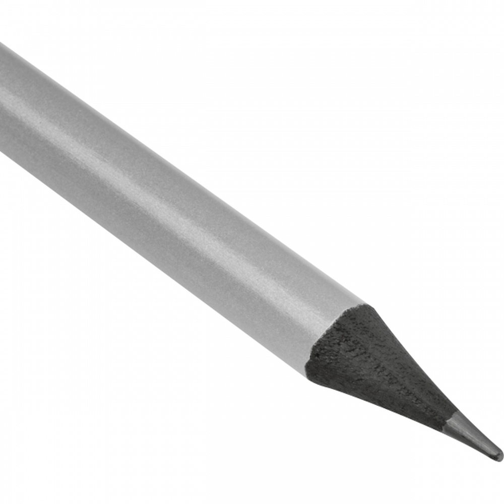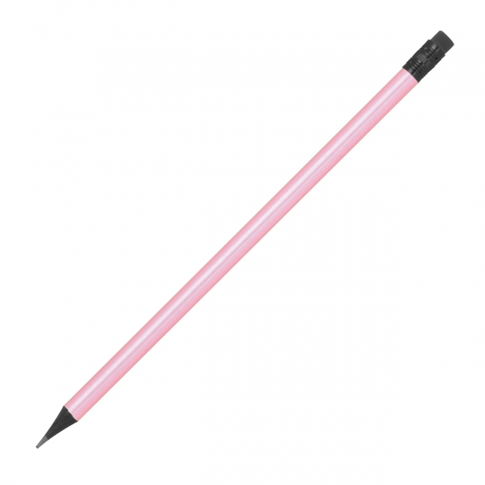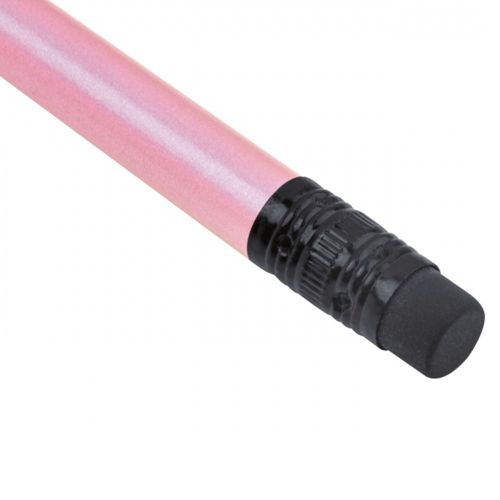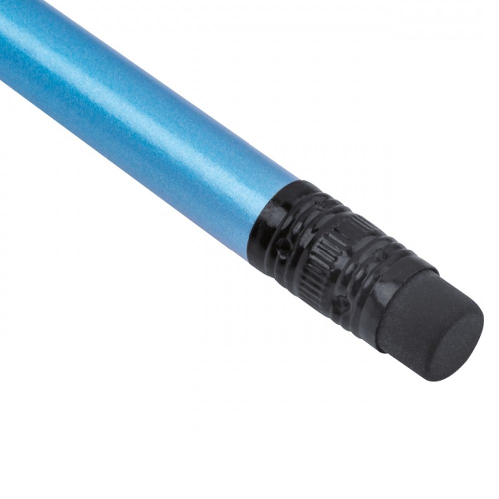 Ołówek z gumką w metalicznych kolorach. Ołówek jest już zaostrzony.