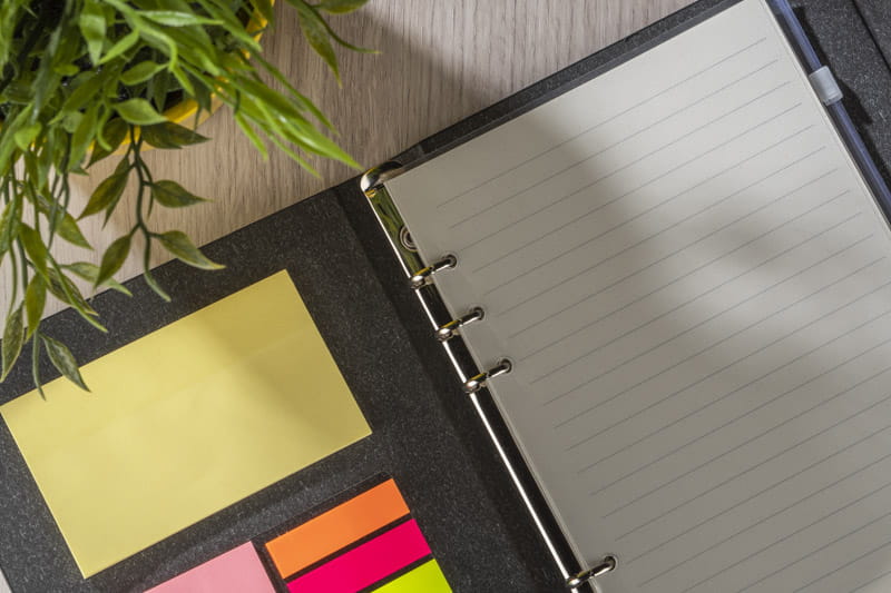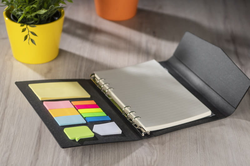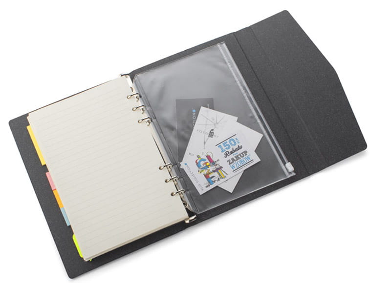 Organizer A5 zawiera 60 kartek w linie z możliwością ich wymiany. Dzięki temu produkt posłuży na długi czas. Wewnątrz znajdują się kolorowe karteczki samoprzylepne, a także transparentna kieszonka zamykana na suwak do przechowywania artykułów biurowych, wizytówek czy na przykład maseczki ochronnej. Okładka zamykana na magnes, wykonana z papieru.
