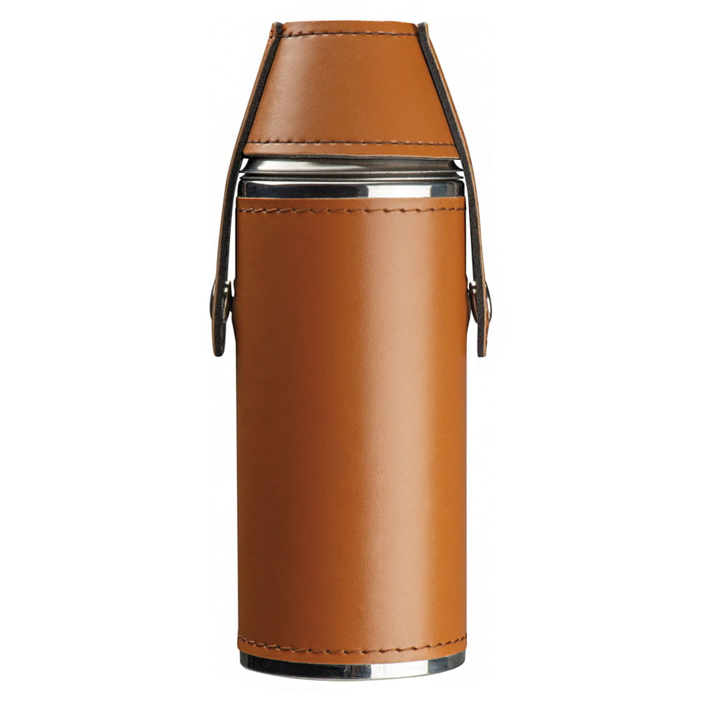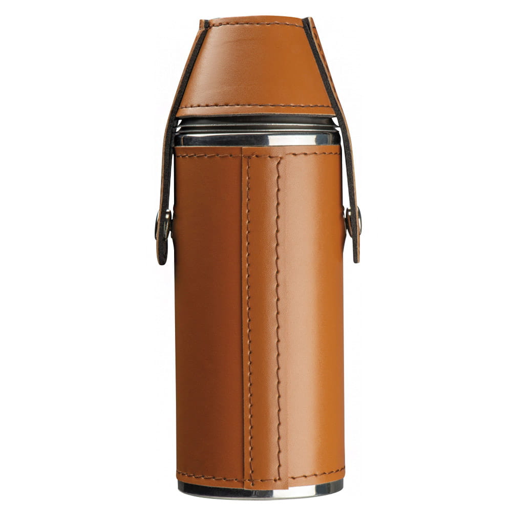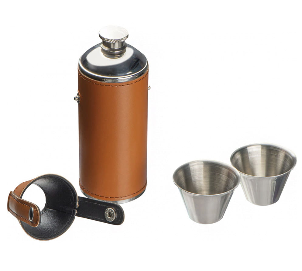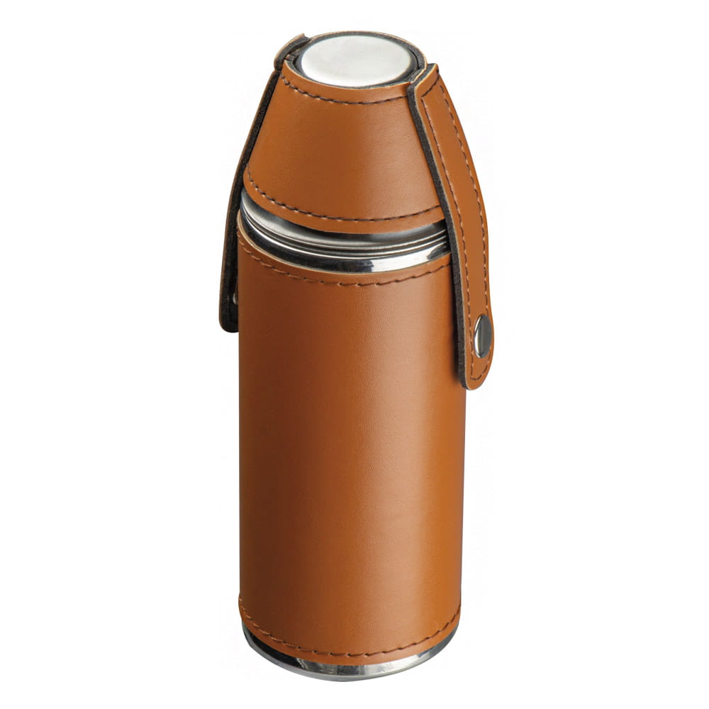 Okrągła piersiówka wykonana ze stali nierdzewnej obita skóropodobnym materiałem PU, z dwoma kieliszkami. Piersiówka ma pojemność 230 ml, kieliszki: każdy po 40 ml.